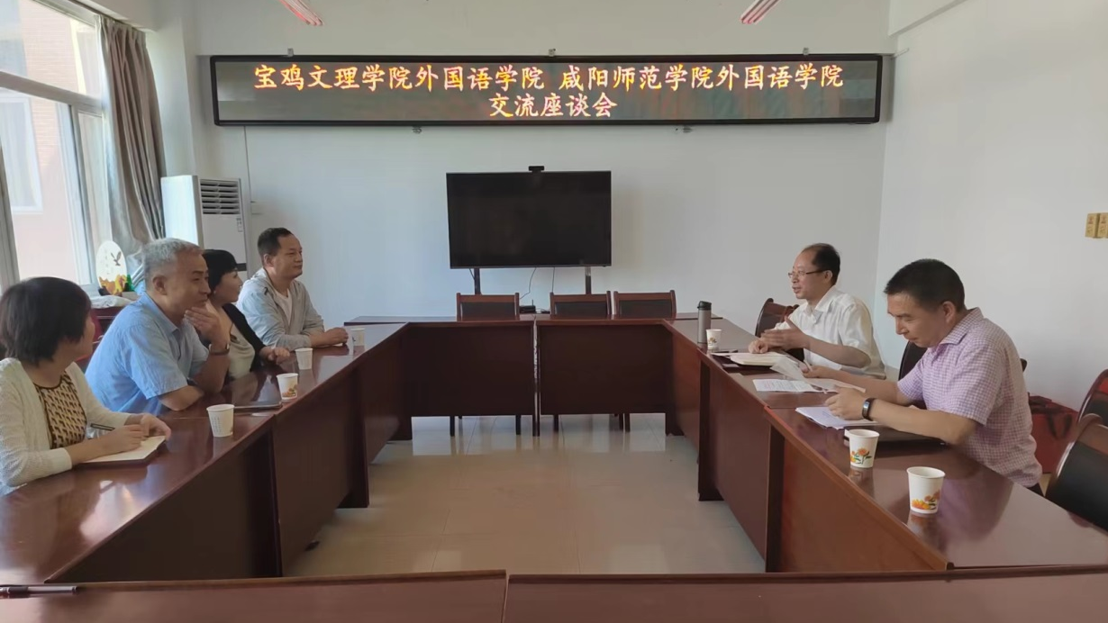 6月24日上午,咸阳师范学院外国语学院副院长史元辉、肖春艳一行四人来bat365外国语学院调研交流,双方在高新校区立心楼419会议室举行座谈交流会。外国语学院党委书记官莉萍,院长李伟,副书记、副院长杨子祁,副院长冯琳参加座谈会,会议由副院长史传龙主持。