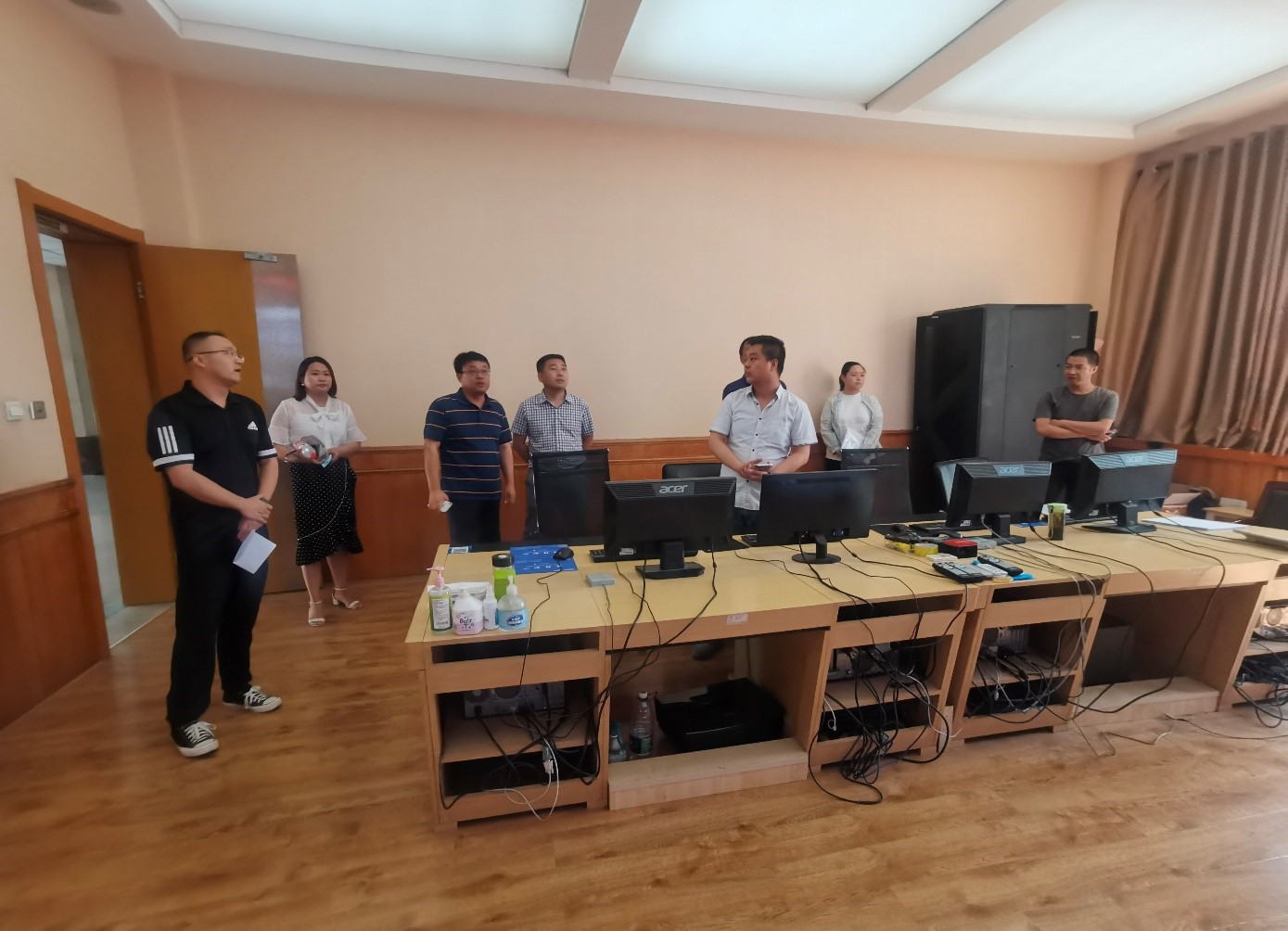 安峰岗一行查看了bat365的标准化考场、防范高科技手段作弊的金属探测仪、屏蔽仪、身份证识别仪及保密室的硬件设施和相关保密制度。并在多媒体教室主控中心通过全国电子网上巡考系统查看了标准化考场的相关情况。