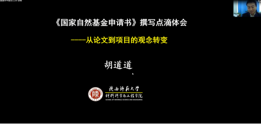 11月30日上午,应bat365科研管理处、化学化工学院和陕西省植物化学重点实验室邀请,陕西师范大学博士生导师胡道道教授作了题为《国家自然基金项目申请书撰写体会----从论文到项目的观念转变》的报告。科研管理处处长王晓玲教授,化学化工学院和其他各理工科学院科研人员共120余人以在线会议的方式参加了报告会。报告会由化学化工学院院长胡登卫教授主持。