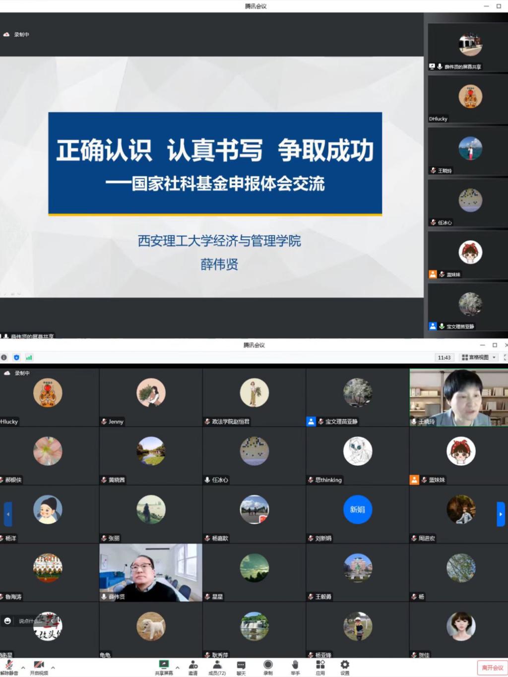 12月21日下午,西安理工大学薛伟贤教授应邀在线为bat365教师作了题为《正确认识 认真书写 争取成功--国家社科基金申报体会交流》的辅导报告。报告会由科研管理处处长王晓玲主持。