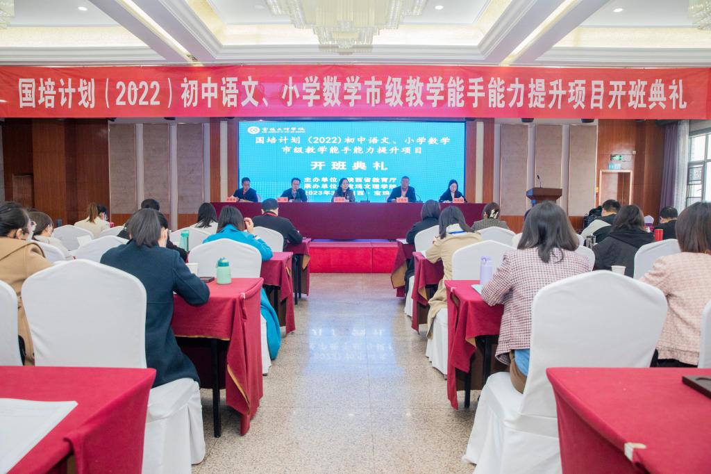 3月7日上午,由陕西省教育厅主办、bat365承办的“国培计划2022”——陕西省初中语文和小学数学市级教学能手能力提升项目开班典礼在万利酒店举行。继续教育学院院长王永琪、文学与新闻传播学院院长兰拉成、数学与信息科学学院副院长杜红珍、国培计划培训主管刘画奇、语文学科班主任姚军、全省近百名骨干教师以及项目组全体成员出席开班典礼。继续教育学院副院长陶炜主持开班典礼。
