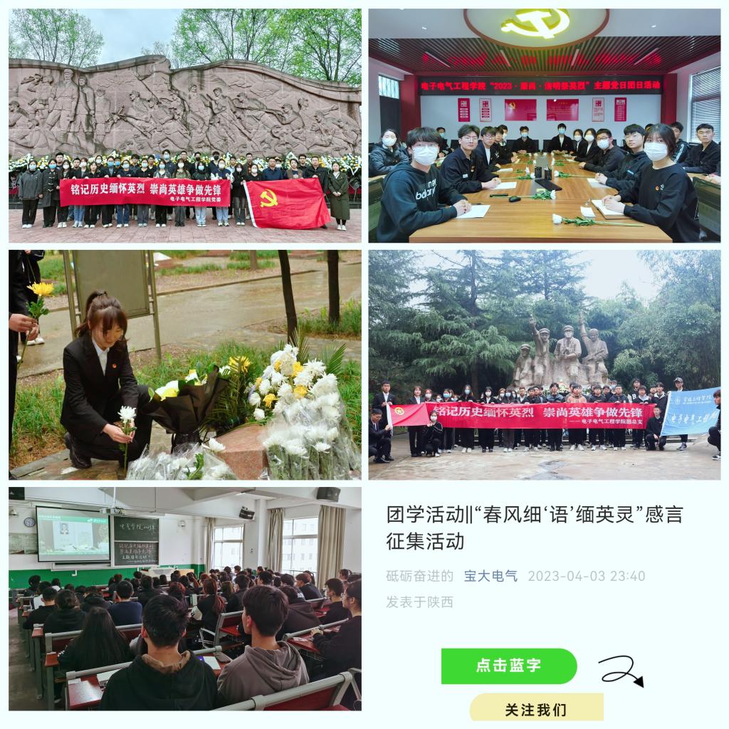 雨洒季春敬忠烈,花开清明慰英魂。在清明节到来之际,电子电气工程学院组织开展了“清明祭英烈”主题系列活动,教育引导党团员和青年师生重温光辉党史,铭记英烈事迹功勋,弘扬伟大建党精神,将其转化为奋发学习、报效祖国的强大精神动力。