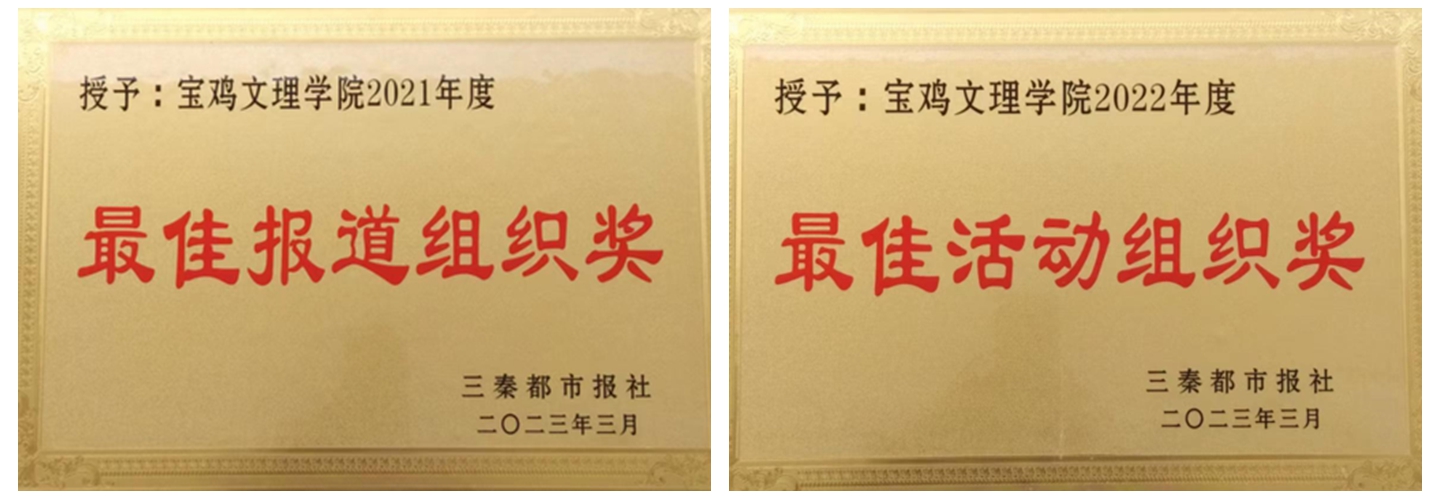 近日,《三秦都市报》对2021年度、2022年度宣传报道工作先进单位和个人进行了表彰奖励,bat365荣获2021年度“最佳报道组织奖”、2022年度“最佳活动组织奖”,宣传部工作人员韩恩强采写的《耄耋老人捐资助学20年》和《颂歌献给党 浓情满山区》分别荣获2021年度“三秦好新闻”二、三等奖,《bat365在线中国官网登录入口大学生给墙体穿“新衣”》和《欢乐送太白 幸福山里娃》分别荣获2022年度“三秦好新闻”二、三等奖。