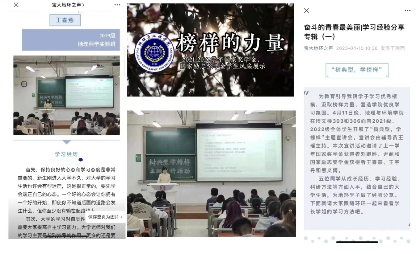 线上线下,同步发力。4月11日,学院在高新校区博文楼303和306教室邀请“获奖学生优秀事迹宣讲团”成员走进班级,与2021级、2022级学生开展面对面交流。宣讲团成员从成长经历、学习科研、考研经验等方面入手,为地环学子做了经验分享。学院利用新媒体平台积极宣传,在微信公众号“宝大地环之声”,连续多期推出了《国奖故事|追光逐梦 不负韶华》《奋斗的青春最美丽|学习经验分享专辑》和《青春风采 榜样力量|国励风采榜》等特辑。学院将2021-2022学年国家奖学金和国家励志奖学金获得者优秀事迹在明理楼一楼循环展示播放,为学院“树典型 学榜样”系列活动起到了积极的宣传作用,营造了比学赶超、奋发向上的浓厚氛围。