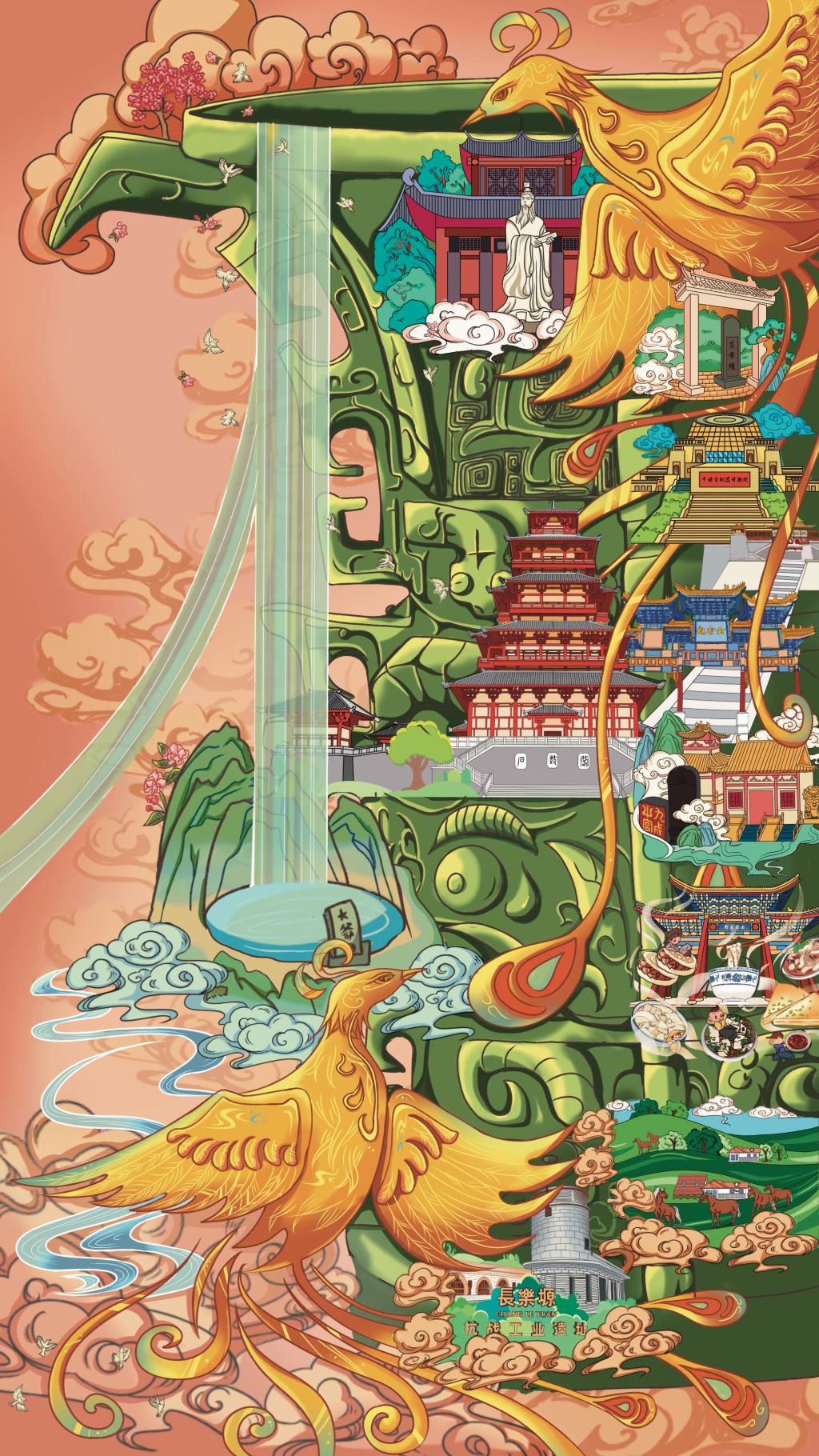 美术学院张海霞老师指导2022级研究生郑玉微,2021级研究生周静、金阳,以国风绘画方式创作宝鸡旅游美景,绘画中涉及宝鸡青铜器博物馆、石鼓阁、西府老街、炎帝陵、周公庙、太白山、关山草原、长乐塬、金台观等多项承载文化意义的地域标志性建筑,其创作理念是将宝鸡文化特色景点进行融合,同时又具备历史积淀和当代价值主题,更是一种文化载体,呈现的不只是宝鸡的旅游美景,也是新时代“宝鸡”的标签,彰显了城市特色。