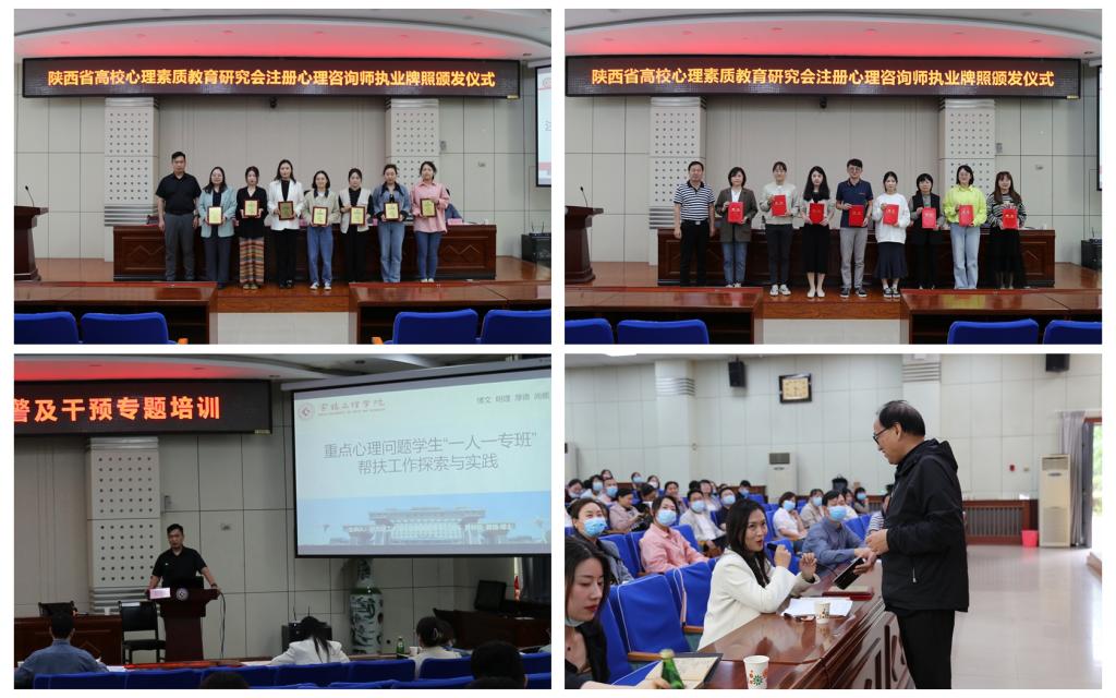 本次专题培训会分为陕西省高校心理素质教育研究会注册心理咨询师牌照颁发仪式及心理危机预警及干预专题培训两个部分。上半场,陕西省高校心理素质教育研究会会长郑林科教授、副会长黄存良教授为bat365取得执业注册心理咨询师的薛茹等23名心理健康专职教师和辅导员颁发执照桌牌;党委学工部部长冯森、郑林科会长与执业注册心理咨询师代表共同签署了《注册心理咨询师执业伦理协议》;冯森宣布了《bat365兼职心理咨询师聘任决定》并向受聘兼职心理咨询师颁发聘书;美术学院辅导员任亚莉代表受聘校内兼职注册心理咨询师做了表态发言。
