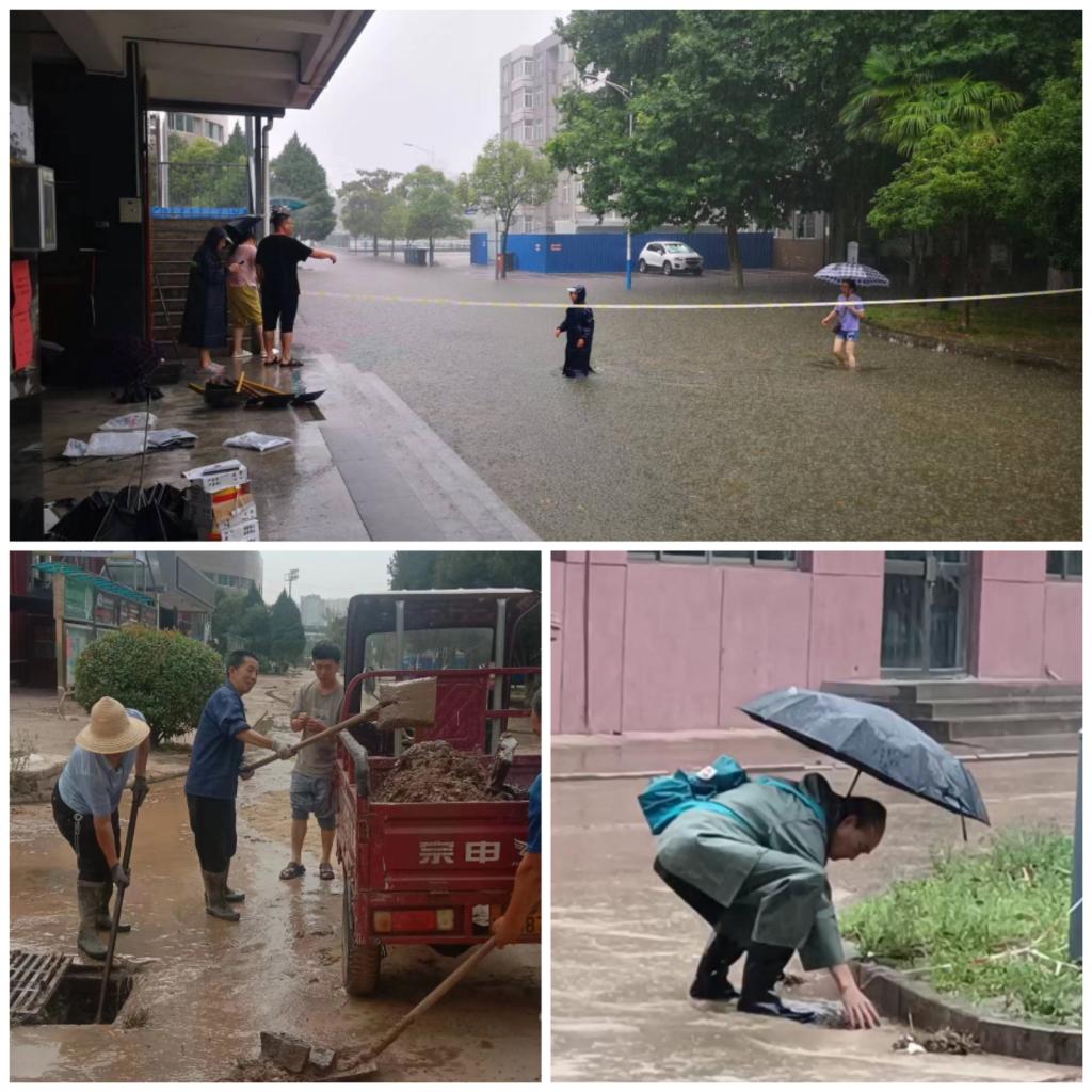 7月27日下午,宝鸡市气象台发布暴雨红色预警信号,后勤管理处(后勤服务集团)立即启动防汛应急预案,组织人员对石鼓、高新校区低洼易积水区域和重点关键区域开展安全巡查工作。教育西路路基塌陷,积水涌入校园,后勤管理处(后勤服务集团)及时设立警示标志、拉警戒线,联系工程抢险车辆、协调沙土30余方,组织人员搬运沙袋堵住溢水口,使用抽水泵排水,清理下水道淤泥、垃圾,疏通雨水井,保障了bat365教职工的生命财产安全。