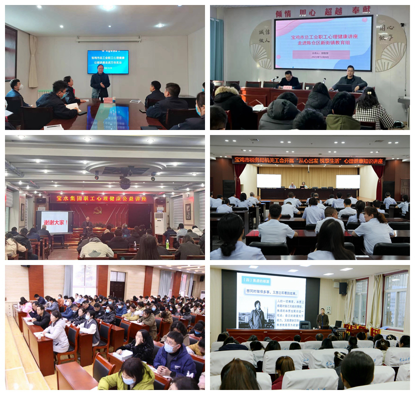 教育学院组织教学经验丰富的彭志启、郭智慧、杨亚锋、许婧4名心理学专业教师分别为西凤酒厂、宝鸡市总工会职工互助保障培训班、宝鸡市税务局、长安银行宝鸡分行、宝鸡市自来水公司、宝鸡市儿童福利院、宝鸡市万和实业公司、姜谭高级中学、新建路中学、宝鸡市龙山小学、经二路小学、陈仓区拓石镇第二九年制学校、陈仓区新街镇教育组、陈仓区千渭初级中学等企事业单位做了职工心理健康教育公益讲座。讲座内容涉及“健康心态,幸福人生”“ 为心赋能,提升职业幸福感”“ 与情绪压力共舞,做幸福员工”“ 心理健康与压力应对”“ 教师心理健康与压力应对”“ 培养积极思维,提升职业幸福”“ 放松减压团体OH卡牌的探索与实践”“学生常见心理问题的识别与应对”等内容。
