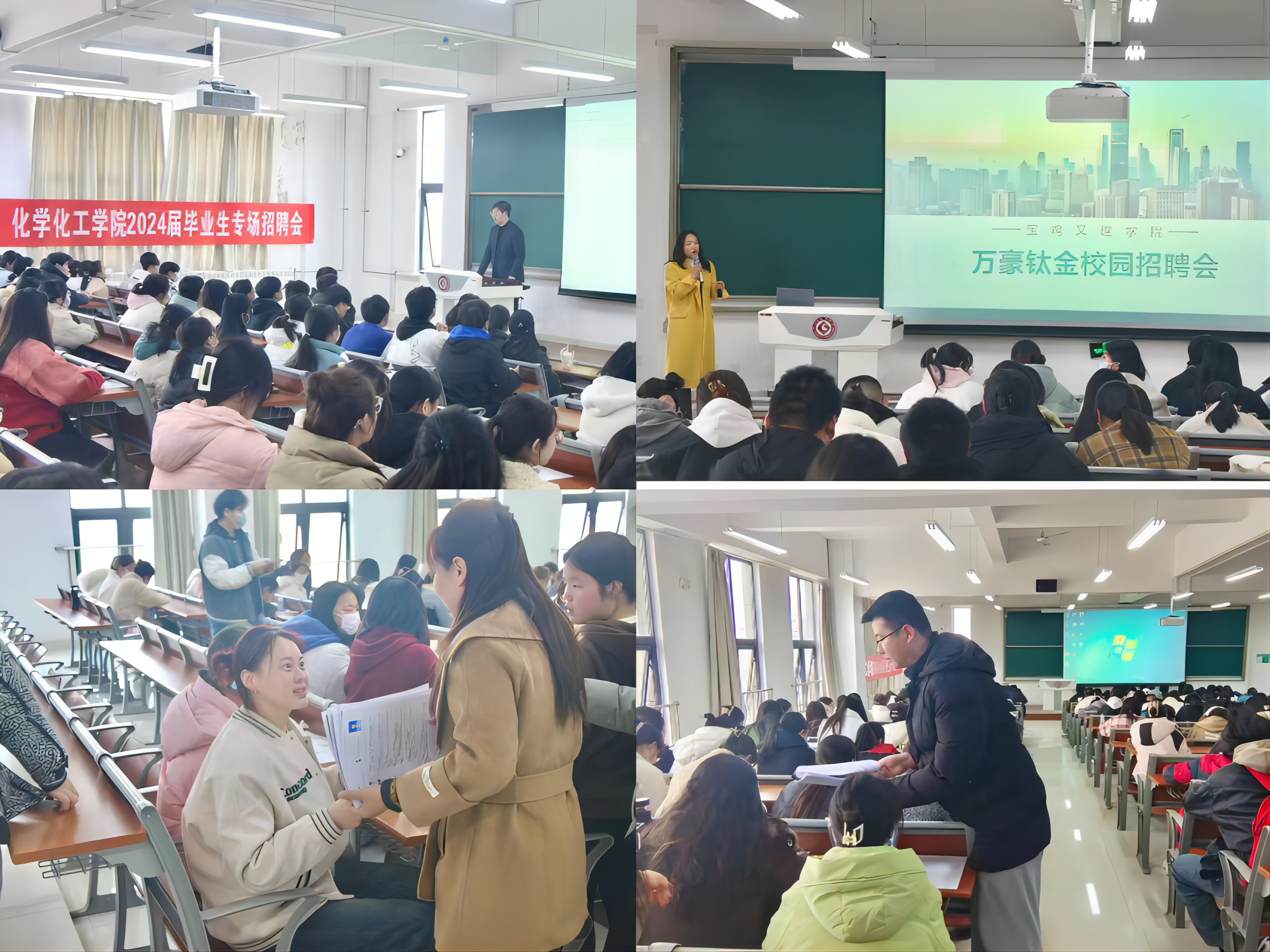 3月6日下午,化学化工学院邀请宝鸡鑫诺特材股份有限公司、陕西瑞科新材料股份有限公司、陕西万豪钛金特材科技有限公司、杭州中美华东制药有限公司在高新校区博文楼副楼305举办毕业生专场招聘会。会议由学院党委副书记王宏江主持。