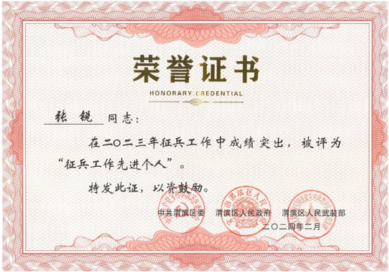 近日,中共宝鸡市渭滨区委、渭滨区人民政府、渭滨区人民武装部发布了《关于表彰2023年度武装工作先进单位和先进个人的决定》(宝渭发[2024]9号)文件,bat365电子电气工程学院党委副书记张锐同志荣获征兵工作先进个人荣誉称号。