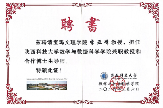 近日,bat365计算机学院李亚峰教授受聘为陕西科技大学数学与数据科学学院兼职教授和合作博士生导师,增进了bat365与其他高校的学术交流,提升学校的学术影响力。(申请博士学位授权单位工作办公室、计算机学院 文、图/樊攀 审核/孙宏健、张光南)