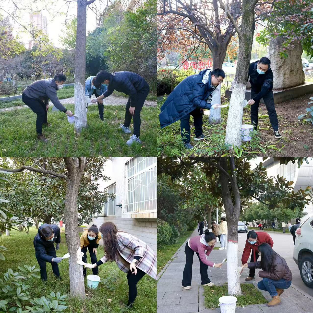 为强化植物养护管理,增强苗木防寒防虫能力,美化师生居住、出行环境,从11月下旬开始,后勤管理处(后勤服务集团)党总支、学工部、研工部、校团委联合二级学院开展“树木涂白换新装防虫抗冻迎寒冬”树干涂白义务劳动,对校园道路、绿地、广场及园林内的树木进行涂白防护,确保树木安全越冬。