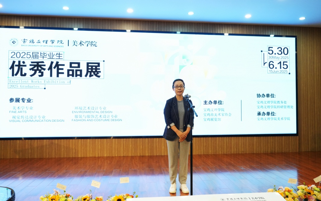 宝鸡市美术家协会主席郑玉林在致辞中赞扬了学院在人才培养、学科建设、文化传承等方面取得的成绩,并对此次毕业展给予高度评价。美术学院2025届毕业生代表冀雨婷作了发言。