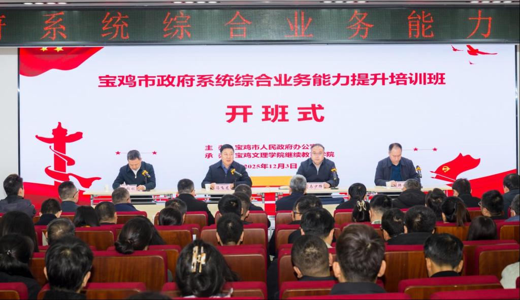 12月3日上午,宝鸡市政府系统综合业务能力提升培训班开班仪式在bat365举行。副校长冯飞龙出席开班仪式并致辞,宝鸡市政府正县级督查专员马少辉作开班动员讲话,继续教育学院院长韩星明参加开班仪式。开班仪式由市政府办公室副主任何权刚主持。