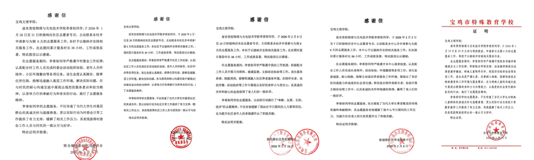 近日,物理与光电技术学院25级物理学专业李香彤同学先后收到新建路社区居委会、新建路社区养老服务中心、新民路社区养老服务站、陈仓镇进新村村民委员会及宝鸡市特殊教育学校发来的感谢信与证明,对其在寒假期间积极投身志愿服务、践行雷锋精神的行动给予肯定与赞扬。