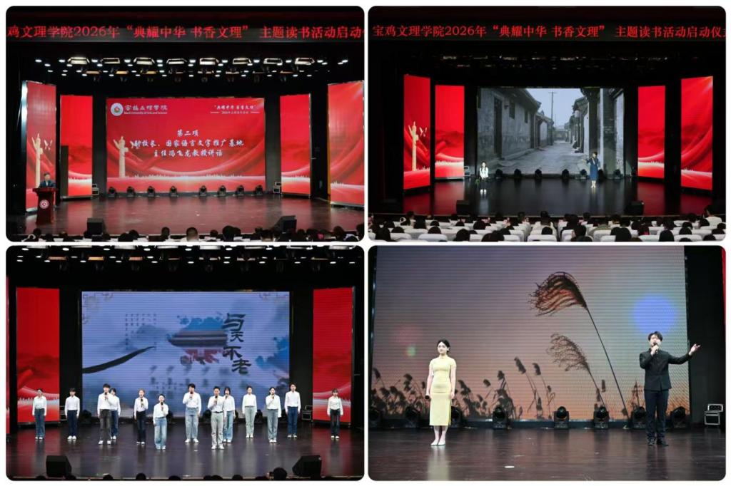 《华商报》宝鸡记者站站长杨托在致辞中对活动启动表示祝贺,同时期待校媒深度联动,共同打造“AI+经典共读”的特色阅读体验。学生代表分享了阅读感悟。在中华经典诵读交流活动中,宝鸡市融媒体中心钟宁诵读《红岩》书信,文学与新闻传播学院师生带来《大堰河——我的保姆》《城南旧事》《采蒲台的苇》《听见青春》,用真挚饱满的声音传递了经典的力量。此次启动仪式标志着bat3652026年“典耀中华 书香文理”主题读书活动正式拉开帷幕。