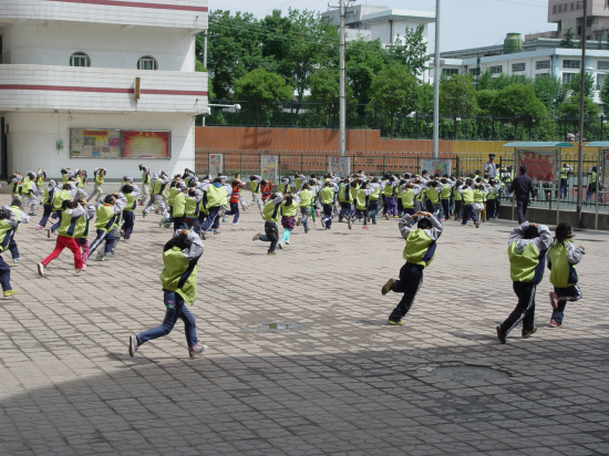 14时40分,随着一阵短促的哨声响起,演练活动开始。教学楼1楼的5个班学生迅速向操场跑去,2楼5个班的学生在老师的指挥下迅速双臂护头,就近躲避;第二次哨声响后,2楼的同学立即撤离教室。全体师生在各楼层负责老师的指挥下,有序到达指定地点。全体学生在操场集合后,各班清点人数并向学校汇报。