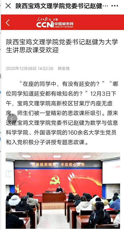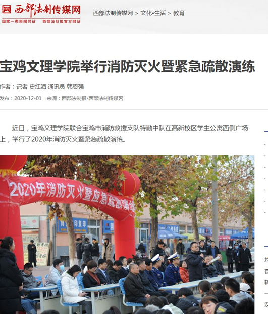 近日,bat365党委书记赵健为大学生讲思政课、举办高等教育学会2020年会暨陕西高等教育论坛、举行消防灭火暨紧急疏散演练等活动引起人民日报新媒体、央视新闻移动网、学习强国、今日头条、文化艺术报等多家媒体的广泛关注和报道。