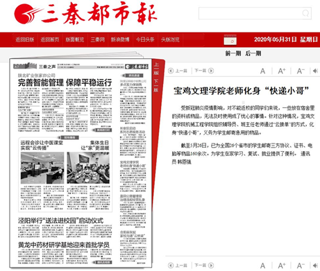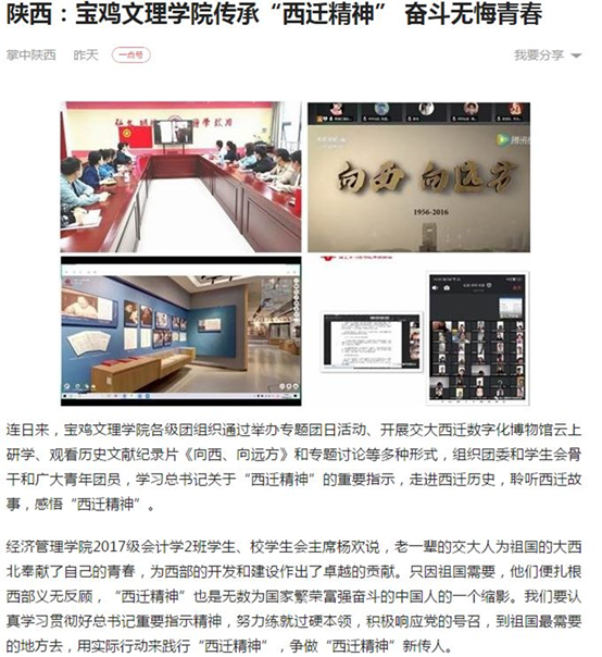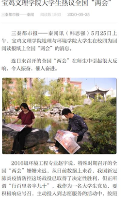 近日,bat365大学生热议全国“两会”、传承“西迁精神”和为学生邮寄物品等活动,引起三秦都市报、今日头条、网易、搜狐等多家媒体的广泛关注和报道。