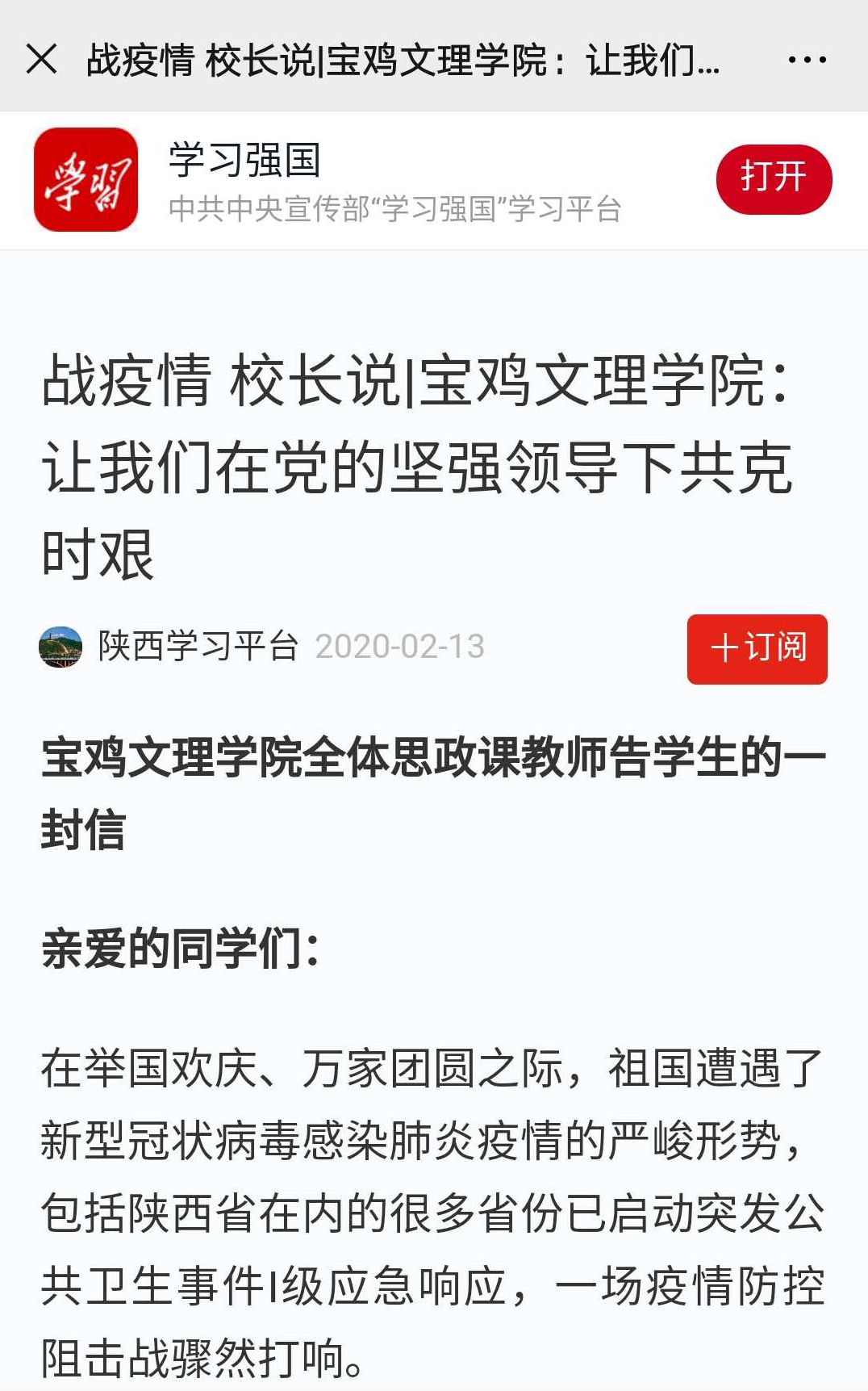 2月12日,马克思主义学院全体思政课教师疫情期间写给文理学子的一封信《让我们在党的坚强领导下共克时艰》,引起了学习强国、中国教育在线、西部网、中国高校之窗等媒体平台的广泛关注和报道,这也是学习强国第5次对bat365进行报道。
