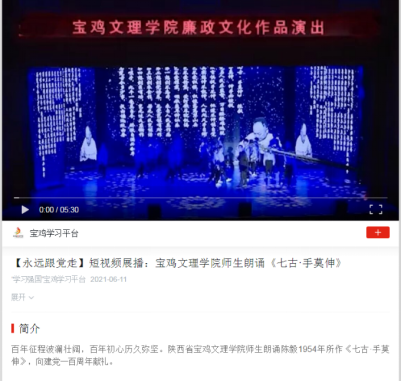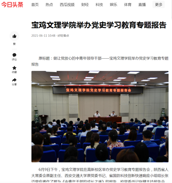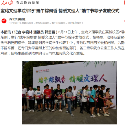 近日,bat365举办党史学习教育专题报告会、为师生发放粽子、大学生征兵宣讲活动等活动引起人民日报新媒体、学习强国、今日头条、宝鸡电视台等多家媒体的广泛关注和报道。