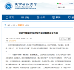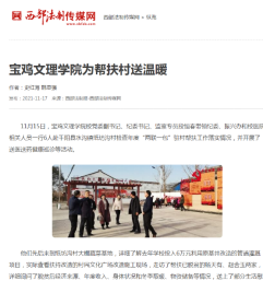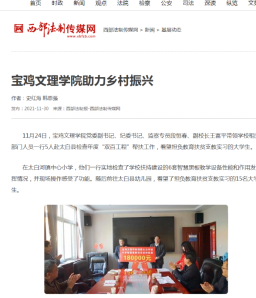 近日,校党委书记赵健为师生宣讲党的十九届六中全会精神、推进党史学习教育走深走实、为帮扶村送温暖等活动引起省教育厅网站、三秦都市报、宝鸡日报、今日头条等多家媒体的广泛关注和报道。