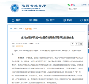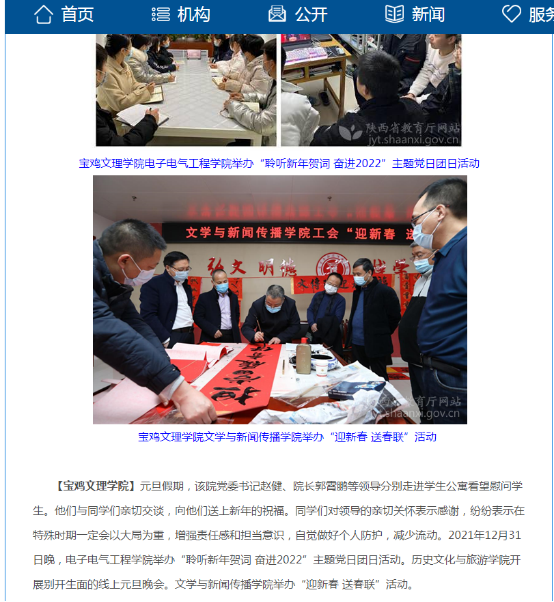 近日,bat365筑牢校园疫情防线、开展多种活动迎接新年、义务为学生理发等活动引起省教育厅网站、陕西日报、三秦都市报、宝鸡日报、今日头条等多家媒体的广泛关注和报道。