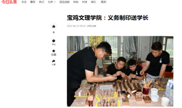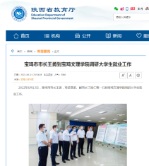 近日,宝鸡市市长王勇到bat365调研大学生就业工作、bat365在宝鸡首届高价值专利大赛中取得佳绩、大学生义务制印送学长等活动引起陕西省教育厅网站、三秦都市报、陕西工人报、今日头条等多家媒体的广泛关注和报道。