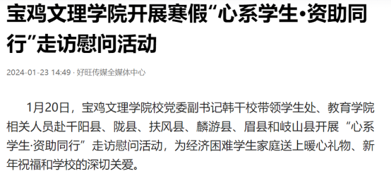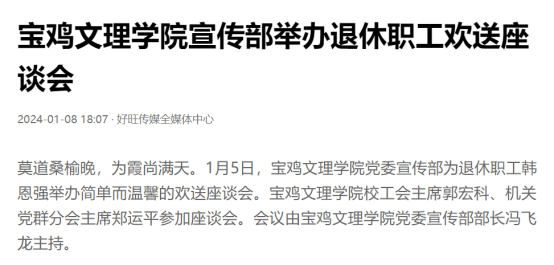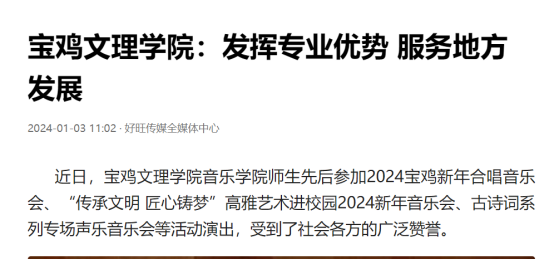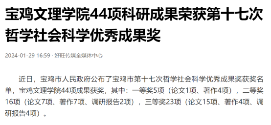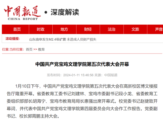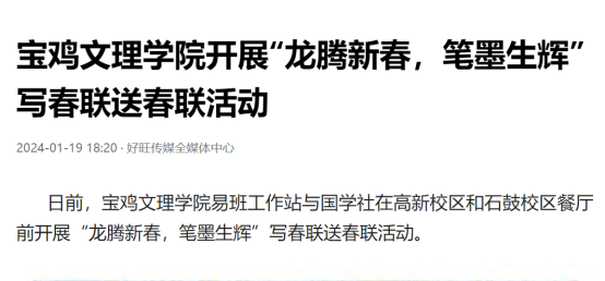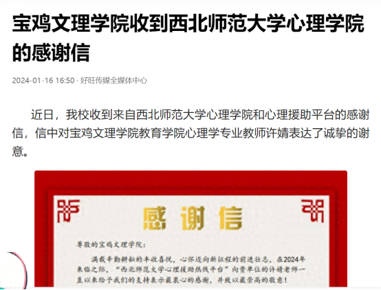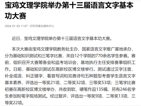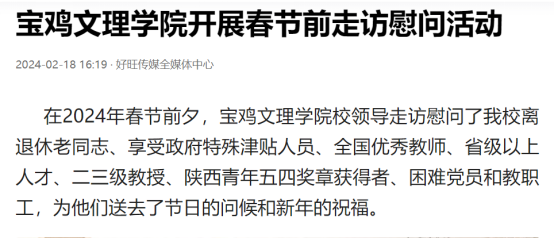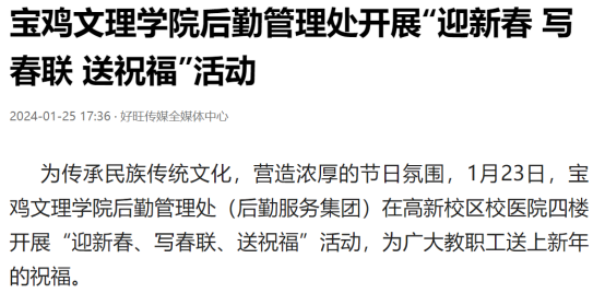 近日,bat365举办第十三届语言文字基本功大赛、发挥专业优势 服务地方发展、宣传部举办退休职工欢送座谈会、2022届毕业生李昊宸荣获“最美三秦西部计划志愿者”之星称号、召开2024届毕业生就业工作推进会、第五次党代会隆重开幕、收到西北师范大学心理学院的感谢信、写春联送春联活动、开展寒假“心系学生·资助同行”走访慰问、获批41项2024年度陕西省科技计划项目、44项科研成果荣获第十七次哲学社会科学优秀成果奖、颜艺艺同学获“陕西省优秀共青团员”称号、开展春节前走访慰问等活动引起中国报道网、阳光网、西部法制传媒网、好旺传媒,阳光报、西部法制报等多家媒体广泛关注和报道。