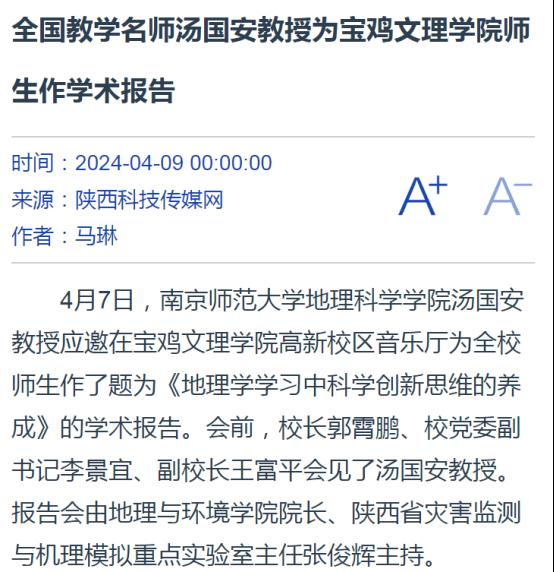 近日,bat365开展4.23世界读书日系列活动、西北工合研究中心科研成果获批国家出版基金资助项目、“马多秀农村教育研究创新工作室”获2023年陕西省教科文卫体系统职工(劳模、工匠人才)创新工作室、1项科研成果获陕西省科学技术奖二等奖、赴太白县开展“双百工程”教育帮扶、全国教学名师汤国安教授为师生作学术报告、中国工程院院士张平教授为师生作学术报告、举办第七届新型功能材料研讨会、举办“保护母亲河•青春在行动”暨第十四届绿植领养等活动引起陕西省教育厅、阳光网、陕西科技传媒网、三秦网、西部法制传媒网、好旺传媒等多家媒体广泛关注和报道。