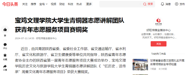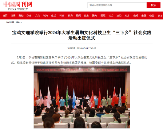 近日,学校举行庆祝中国共产党成立103周年暨“七一”表彰大会、代表团前往马来西亚和新加坡开展校际合作交流、举行2024年大学生暑期文化科技卫生“三下乡”社会实践活动出征仪式、与宝鸡市础石金属检测有限责任公司签订校企合作战略协议、宝鸡市低空智能飞行研究院揭牌成立、大学生青铜器志愿讲解团队获青年志愿服务项目赛铜奖、开展“美丽中国 青春行动”专项暑期社会实践活动、组织师生赴茵香河文化旅游区开展暑期社会实践活动、开展“艺路有你相伴 助力文化振兴”暑期社会实践活动、前往陇县开展实践调研活动、“青禾硕果”乡村振兴社会实践团开展实践活动等引起陕西省教育厅-新闻-热点聚焦、中国周刊网、阳光报、阳光网、陕西科技传媒网、宝鸡一点通-宝鸡市融媒体中心等多家媒体广泛关注和报道。