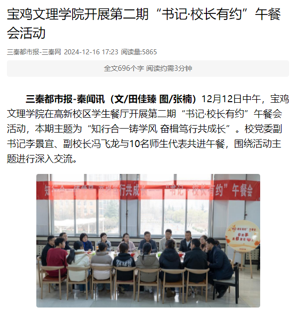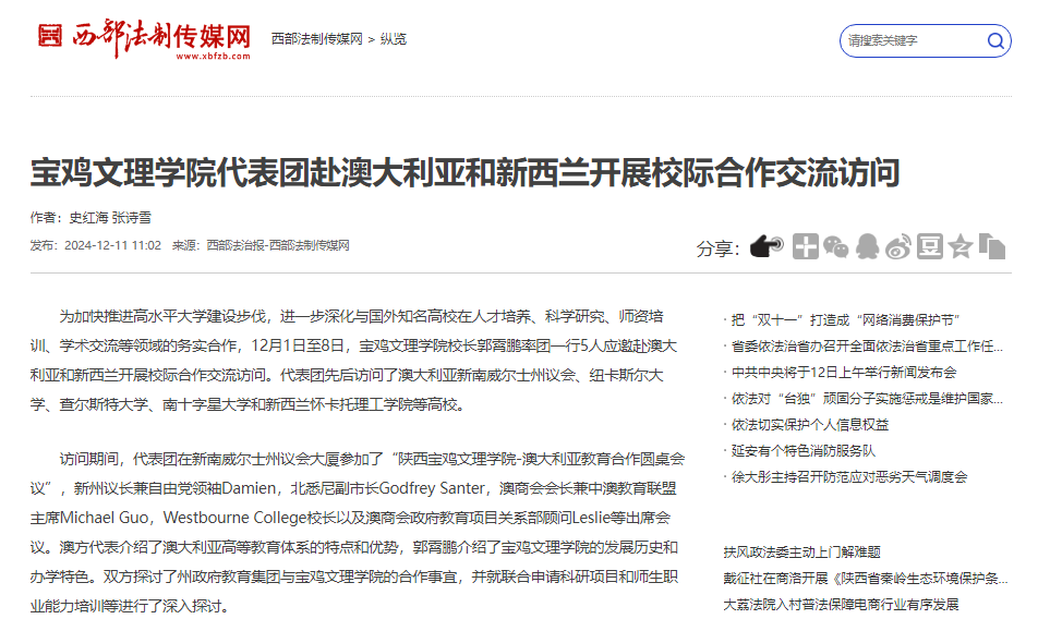 近日,宝鸡市委书记杨广亭为bat365师生讲授思政课,宝鸡市产教融合企业“院校行”活动在bat365举行,学校代表团赴澳大利亚和新西兰开展校际合作交流访问,开展第二期“书记·校长有约”午餐会活动,举办就业工作人员职业规划与就业指导能力提升培训班等活动引起学习强国、西部法制传媒网、三秦都市报、群众新闻网、民生网、城市金融网、陕西科技传媒网、今日头条等多家媒体广泛关注和报道。