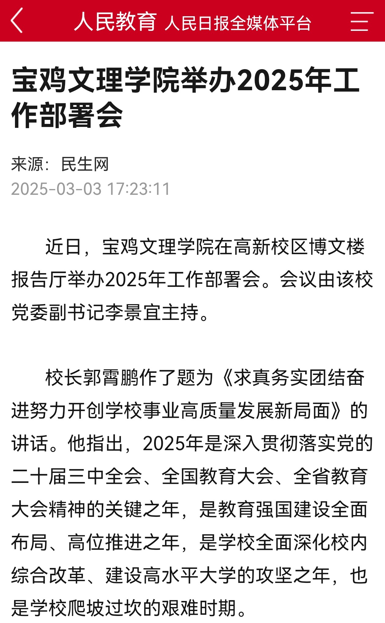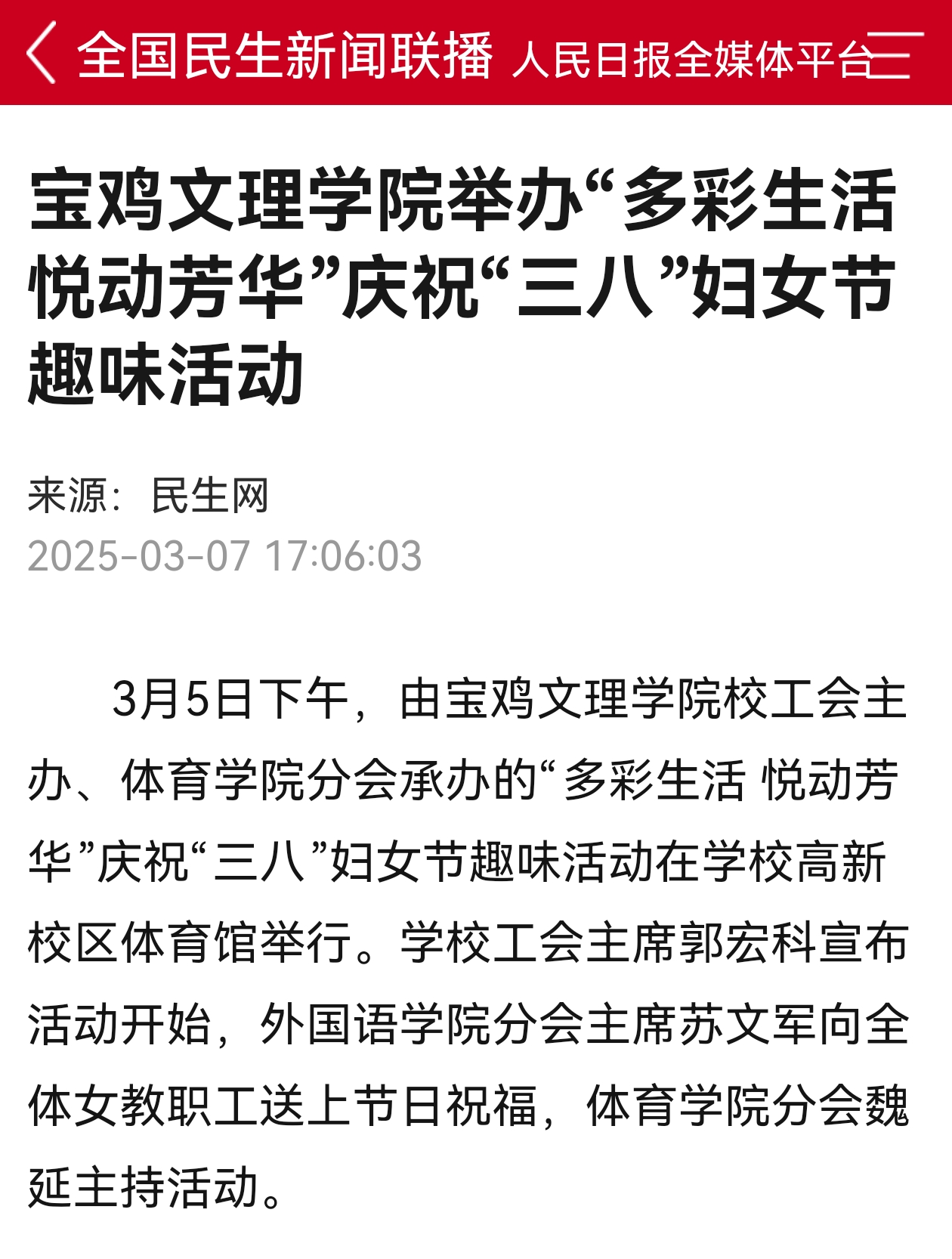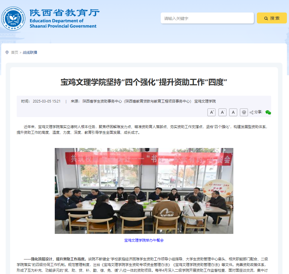 近日,bat365召开2025年工作部署会、学校师生热议2025年全国两会、bat365坚持“四个强化”提升资助工作“四度”、学校举办“多彩生活 悦动芳华”庆祝“三八”妇女节趣味活动、学校开展2025年“一院一主题”学雷锋志愿服务展示活动、bat365美术学院开展校园墙面彩绘等活动引起学习强国、陕西省教育厅、民生网、三秦都市报、各界新闻网、西部法治报、阳光网、陕西教育信息网、陕西科技传媒网、宝鸡市融媒体中心、起点宝鸡、网易新闻、今日头条等多家媒体广泛关注和报道。