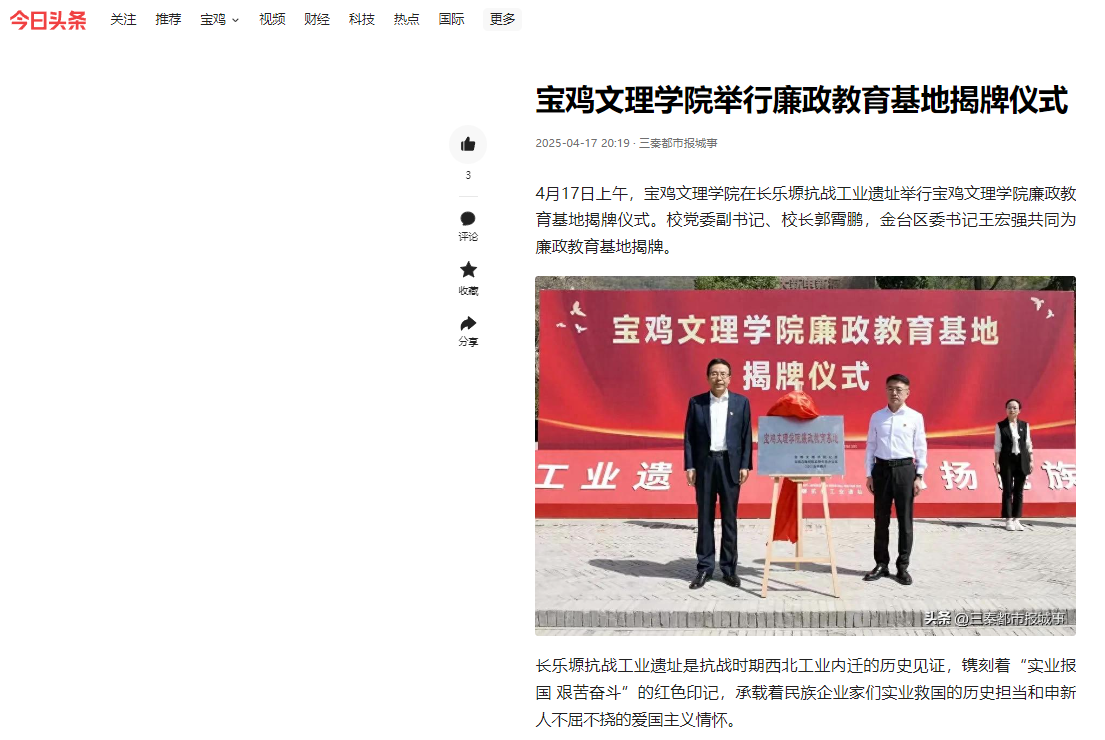 1.今日头条-三秦都市报城事 链接:https://www.toutiao.com/article/7494254274189197858/?timestamp=1744893436&share_uid=MS4wLjABAAAAToWn4hQCYtHtn_ZnyeEuYMoi04tBmTei9OGcguCAums&category_new=profile_all&app=news_article&share_did=MS4wLjACAAAAcSUB66Rf6ZS3HA8N1luhsQoNTOTMiBSiWv184rzhTBc&share_token=ceeb495d-f488-45ae-9f1e-cc9ed200aa2f&wxshare_count=2&utm_source=&source=m_redirect