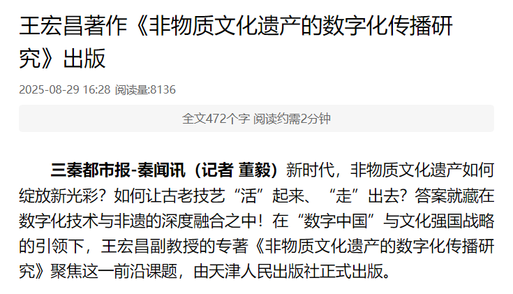 八、王宏昌著作《非物质文化遗产的数字化传播研究》出版
