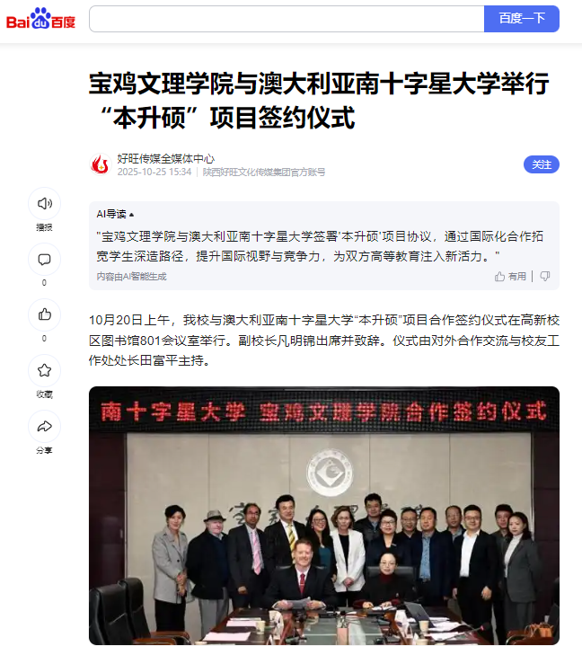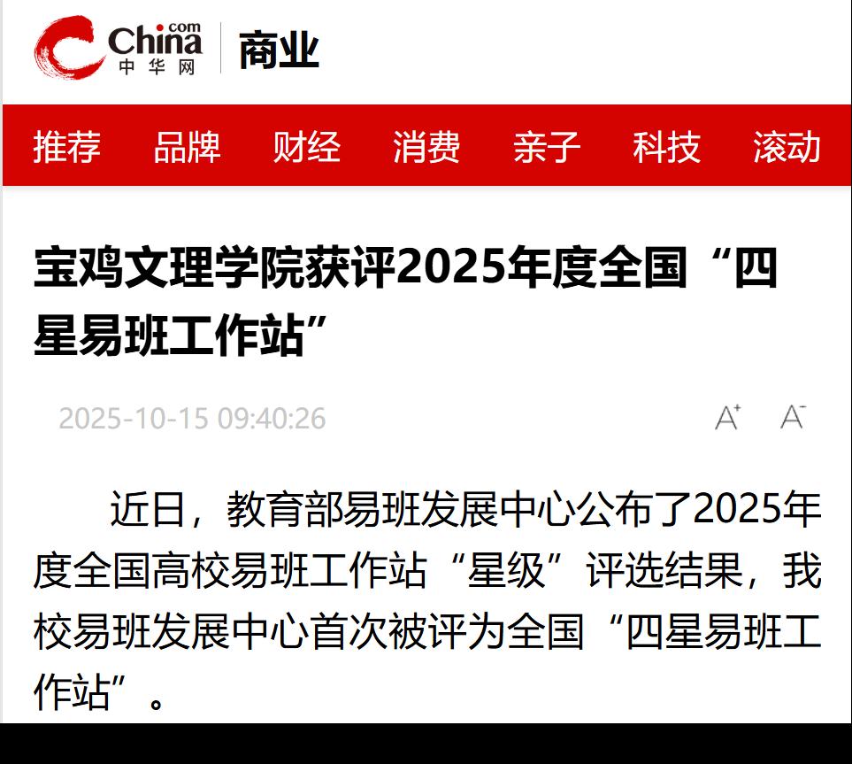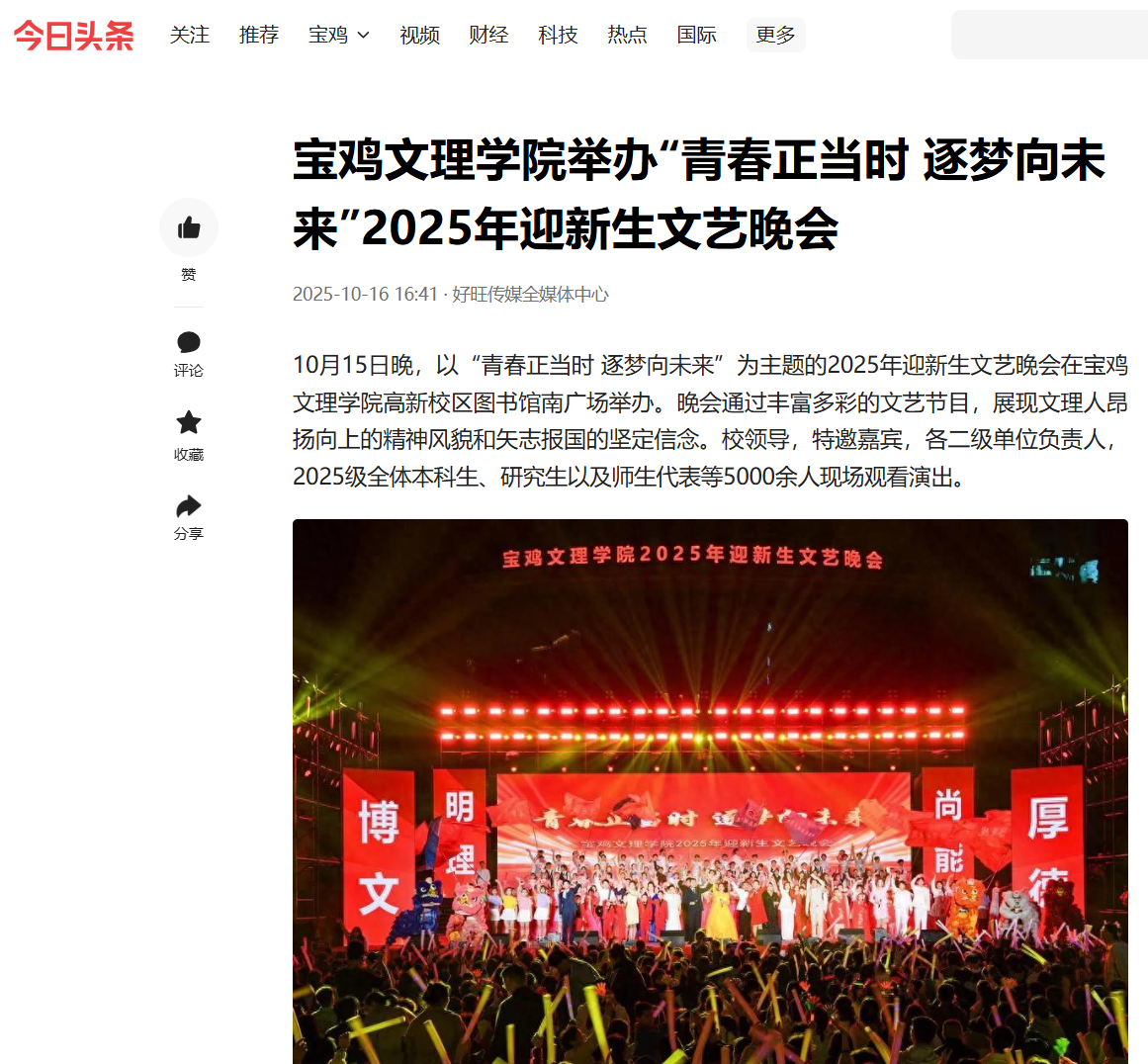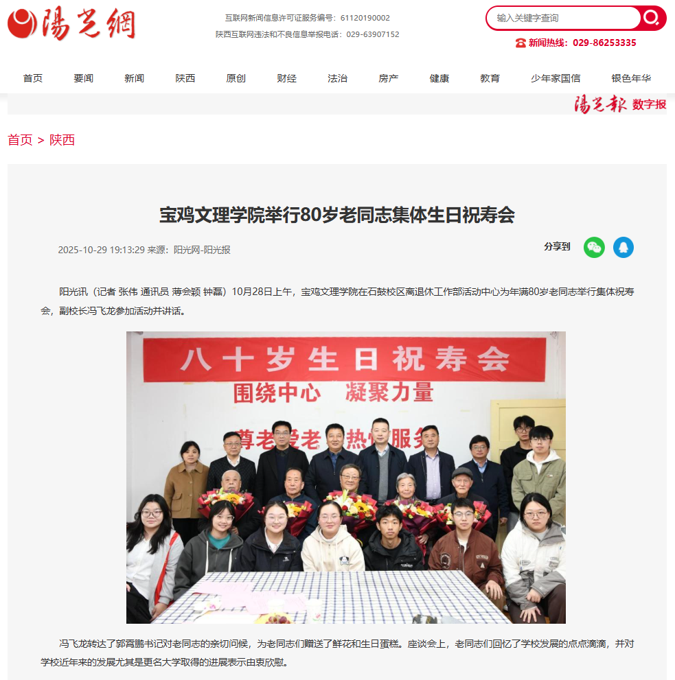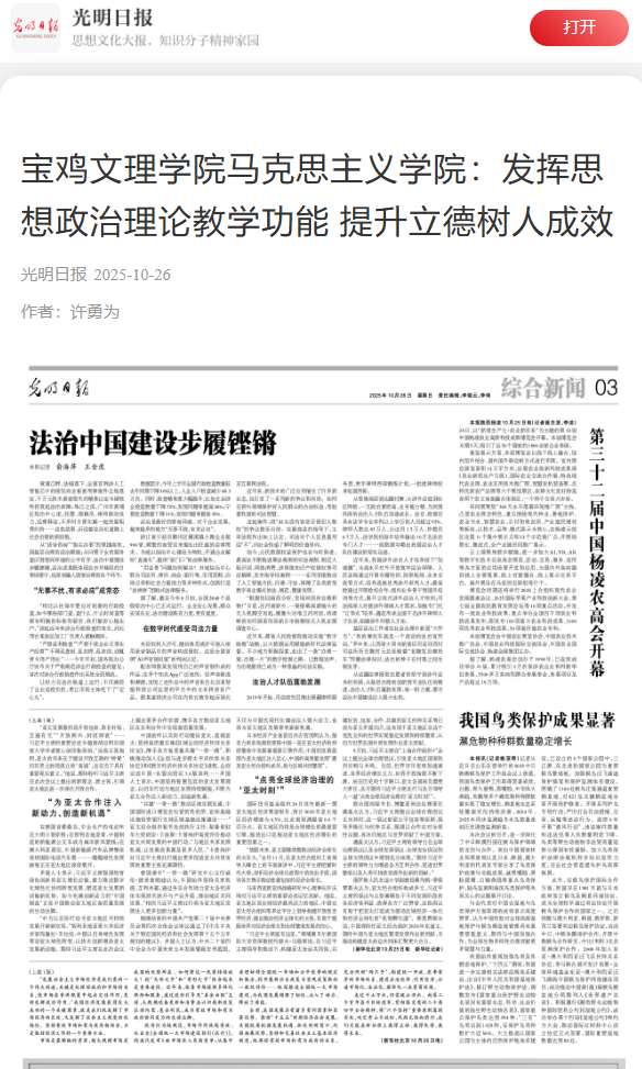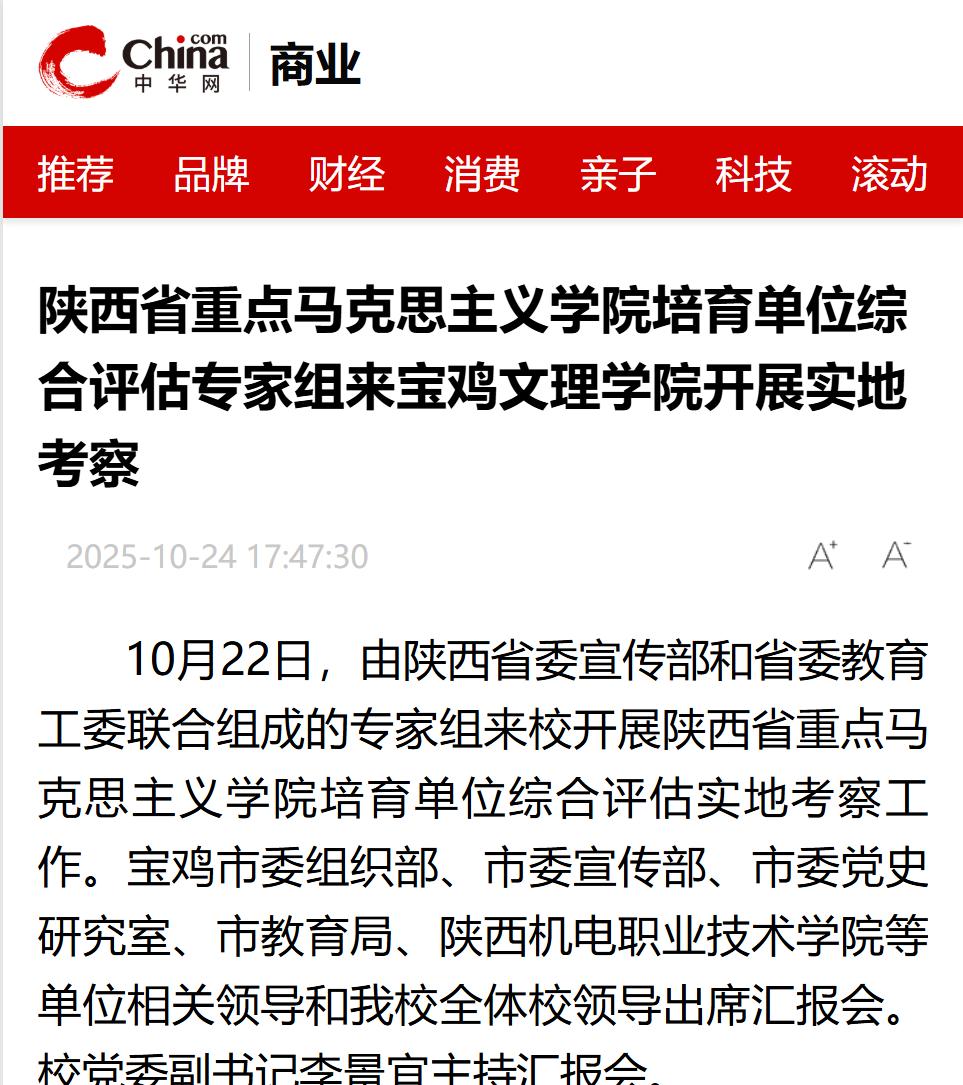 近日,陕西省重点马克思主义学院培育单位综合评估专家组来校考察、学校举办“青春正当时 逐梦向未来”2025年迎新生文艺晚会、获批7项陕西省社会科学基金年度项目、获评2025年度全国“四星易班工作站”、在第十五届全国大学生红色旅游创意策划大赛总决赛中获一等奖、与澳大利亚南十字星大学举行“本升硕”项目签约仪式、《光明日报》刊登文章报道bat365马克思主义学院、bat365师生赴太白县航天科技馆开展主题学习活动、举行80岁老同志集体生日祝寿会、政法学院副教授吕晓伟担任“高水平管理赋能高质效办案”理论研讨会评委指导、学校组织开展“雅韵茶礼 书揽秋光”女教职工茶艺体验活动、bat365志愿者参与2025宝鸡马拉松志愿服务等活动引起《光明日报》、阳光网、陕西科技传媒网、城市金融网、政法新闻网、《宝鸡日报》、宝鸡融媒、中华网、今日头条、搜狐网、百度等多家媒体广泛关注和报道。