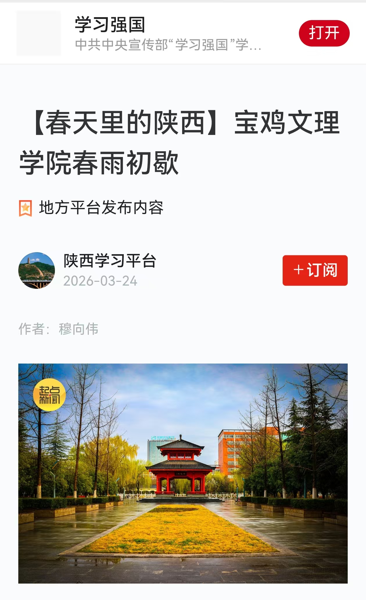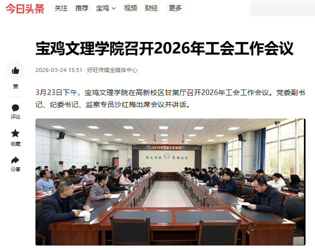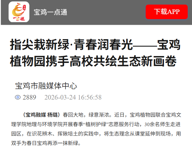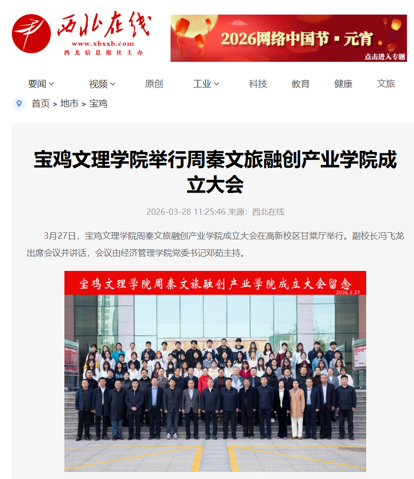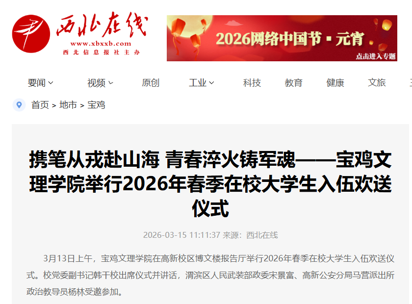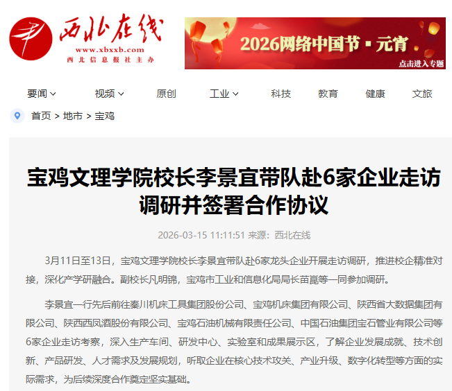 近日,校长李景宜带队赴6家企业走访调研并签署合作协议、bat365举行周秦文旅融创产业学院成立大会、开展学雷锋志愿服务活动、召开2026年工会工作会议、举行2026年春季在校大学生入伍欢送仪式、地理与环境学院联合宝鸡植物园开展志愿活动、校园春日美景等引起学习强国、西北在线、起点新闻、陕西乡村振兴网、宝鸡市融媒体中心、阳光网、中华网、网易新闻、今日头条等多家媒体广泛关注和报道。