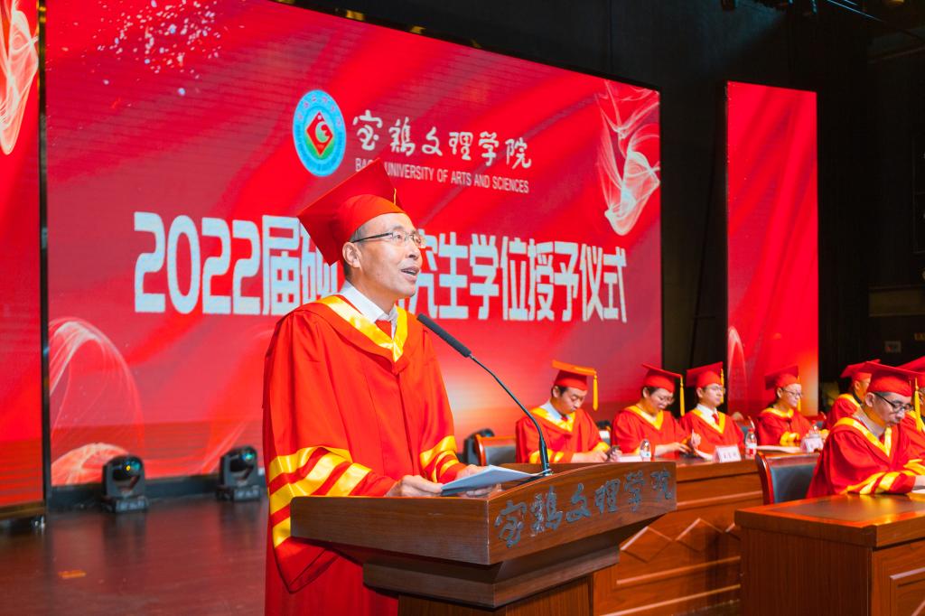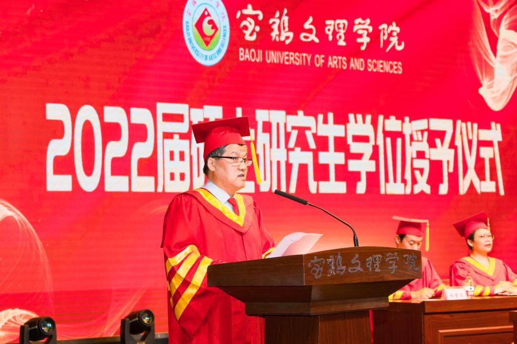 仪式在庄严的国歌声中开始。王富平宣读了2022届硕士研究生学位授予决议和关于表彰2022届省级/校级优秀毕业生、优秀学位论文获得者、优秀研究生干部、2021年度优秀研究生导师的决定。伴随着《加冕进行曲》,郭霄鹏为2022届硕士研究生逐一扶正流苏、颁发学位证书,并合影留念。会议表彰了省级和校级优秀毕业生、校级优秀学位论文获得者、优秀研究生干部、优秀研究生导师。