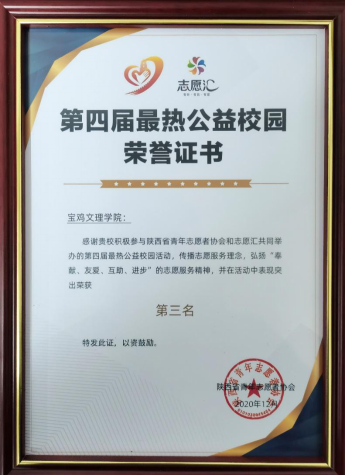 近日获悉,在陕西省青年志愿者协会和志愿汇共同举办的第四届最热公益校园活动中,bat365喜获第三名。