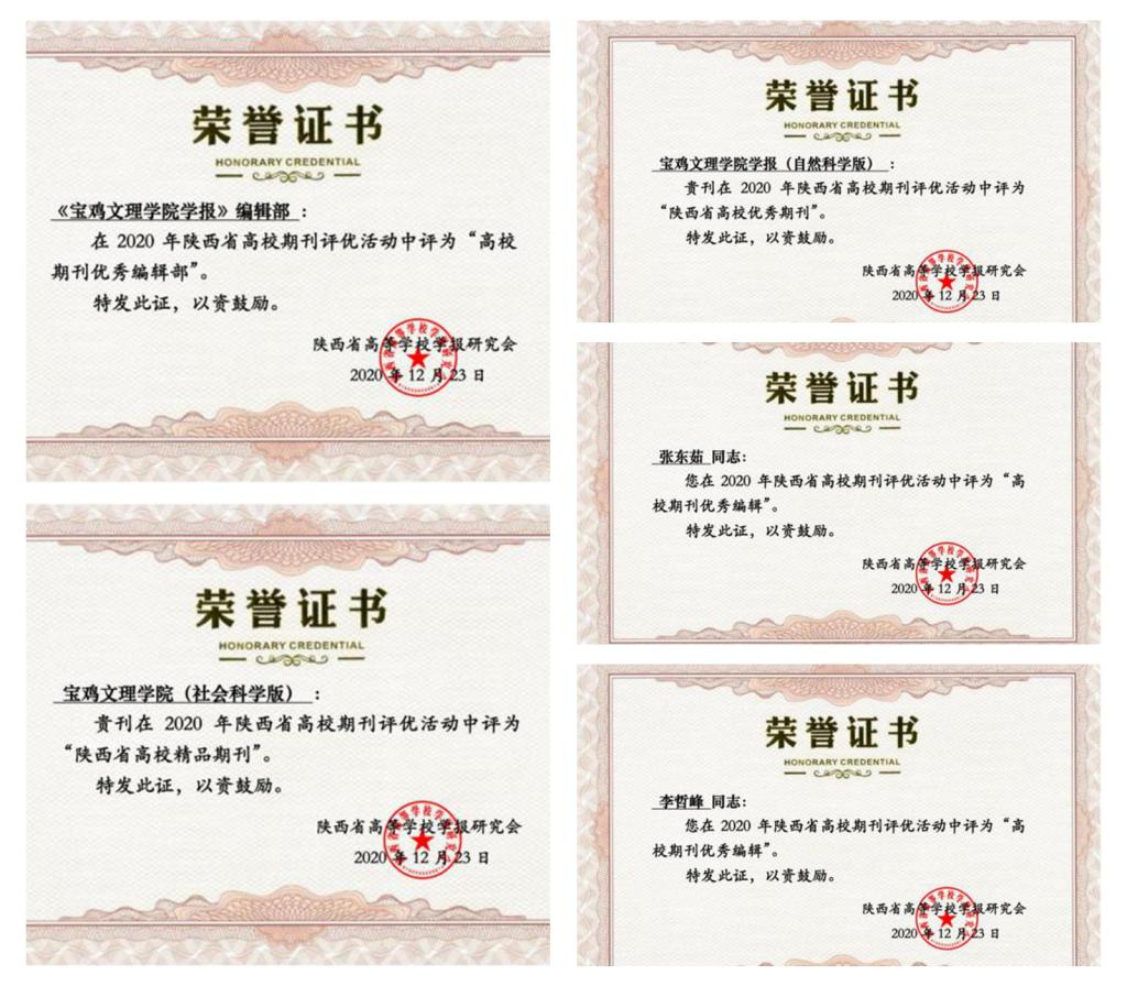 近日,从陕西省高等学校学报研究会获悉,在2020年陕西省高校期刊评优活动中,bat365学报编辑部获得多项荣誉。bat365在线中国官网登录入口学报编辑部被评为“高校期刊优秀编辑部”,《bat365在线中国官网登录入口学报(社会科学版)》被评为“陕西省精品期刊”,《bat365在线中国官网登录入口学报(自然科学版)》被评为“陕西省优秀期刊”;张东茹和李哲峰副编审被评为“高校期刊优秀编辑”。