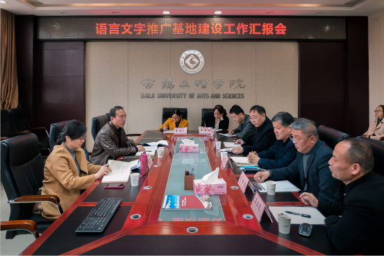 汇报会在图书馆806会议室举行。王富平对考察组一行的到来表示热烈欢迎,并全面介绍了学校的发展历史、专业设置、学科建设、人才培养等方面的具体情况。教务处处长田延峰从基本情况、主要工作及特色、存在不足及改进措施三个方面汇报了bat365国家语言文字推广基地建设工作,并展示了视频等相关佐证材料。