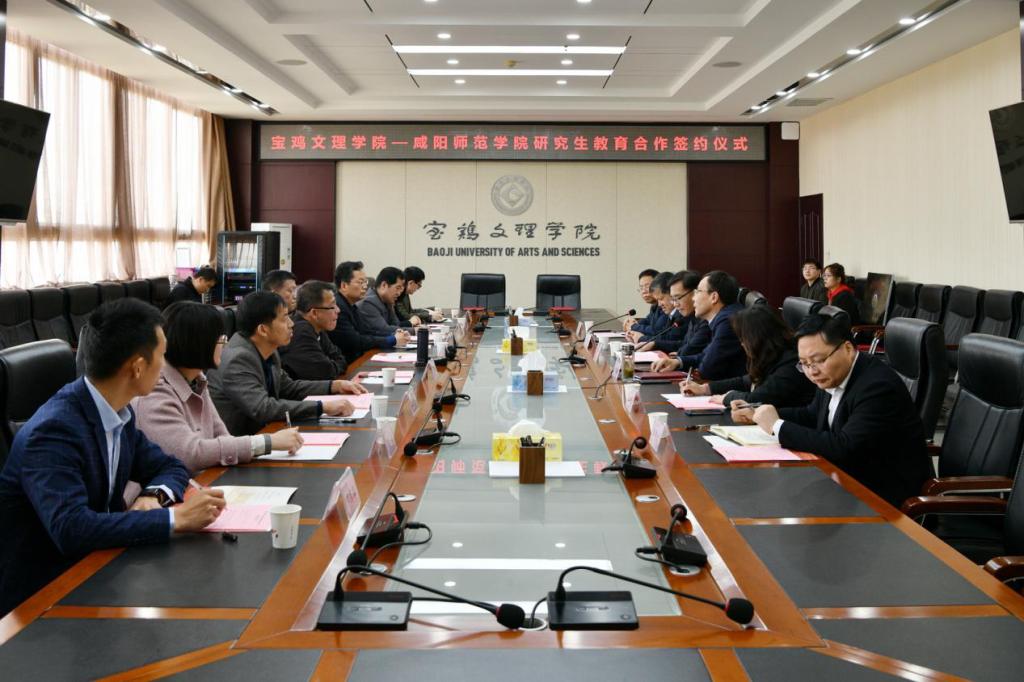 4月16日上午,咸阳师范学院党委书记赵万东、校长舒世昌、副校长张弘一行9人来校商榷研究生联合培养事宜。双方在高新校区图书馆801会议室举行了研究生教育合作签约仪式,校党委书记赵健、校长郭霄鹏出席签约仪式,副校长王富平主持仪式。