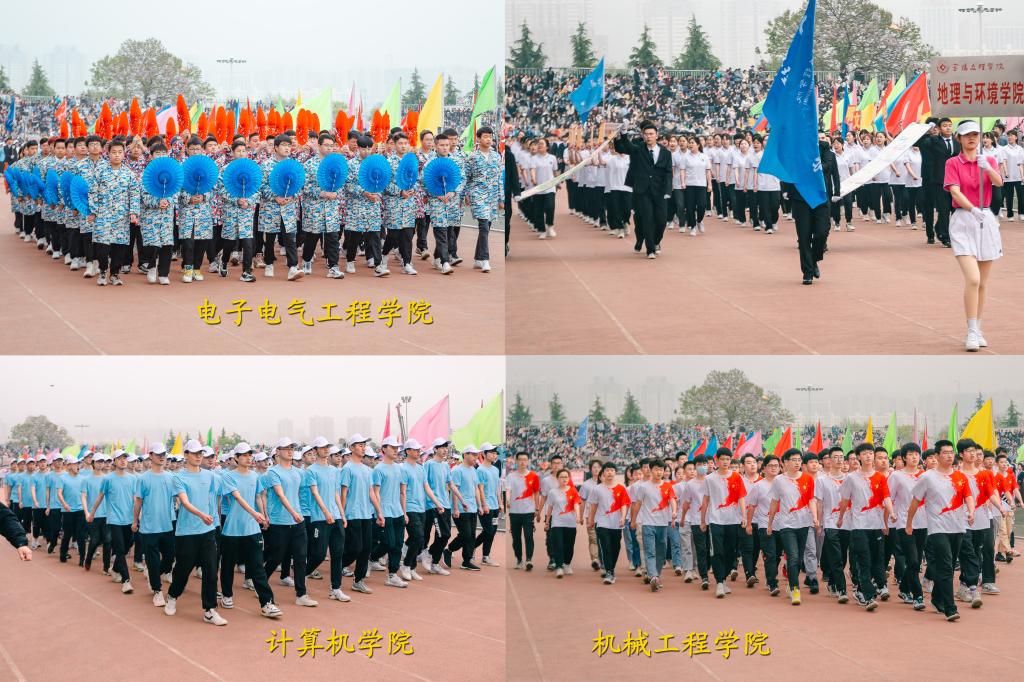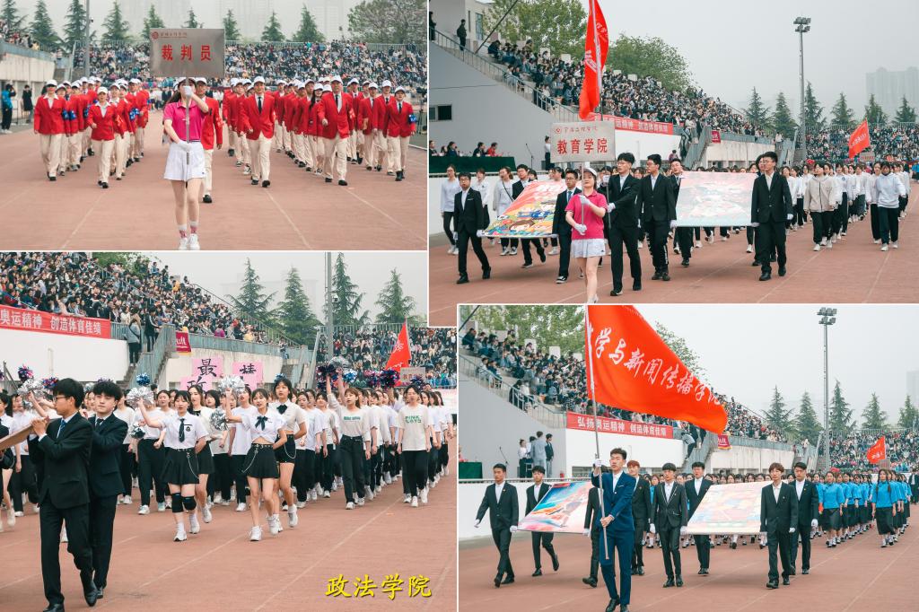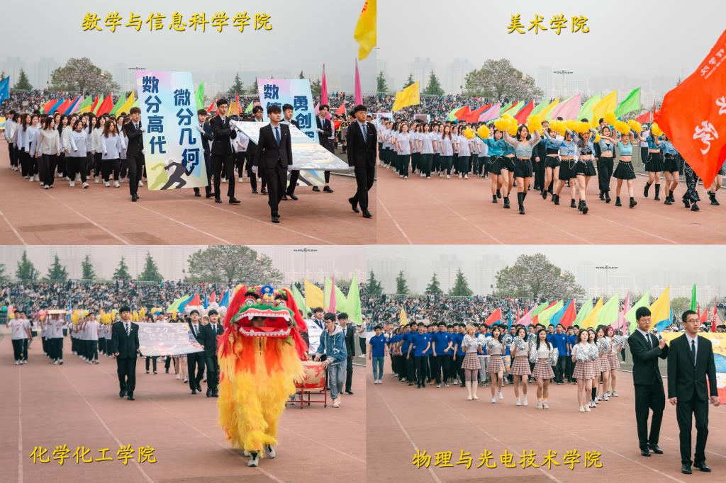上午八时,国旗、校旗、五环旗护卫队、青年志愿者、裁判员及各单位运动员组成的方队,迈着青春的步伐,和着运动员进行曲的节拍,有序走过主席台,他们步伐坚定,口号整齐,体现了bat365师生饱满的体育运动精神。