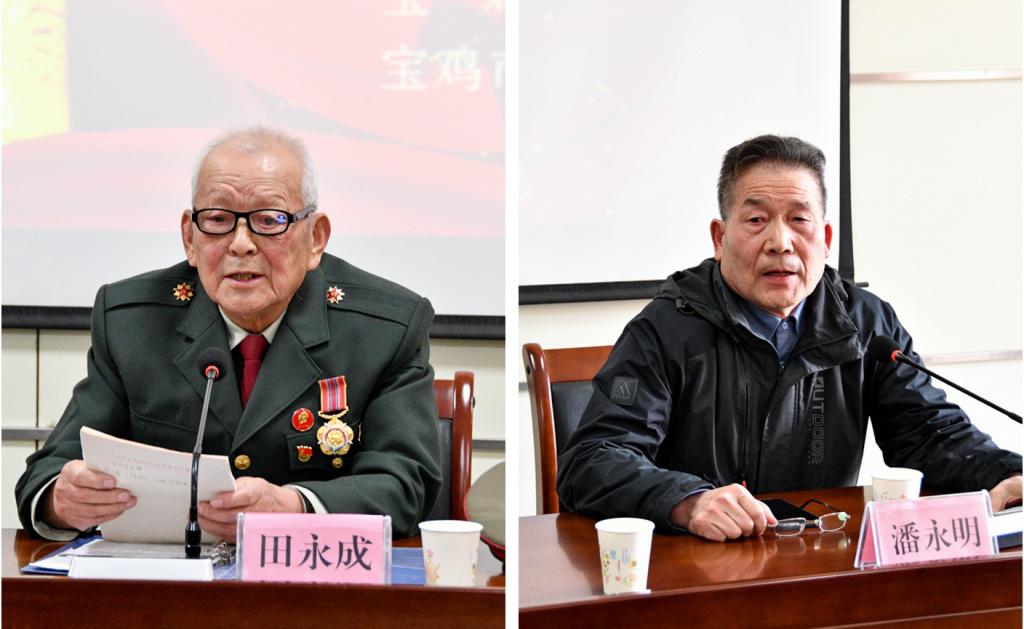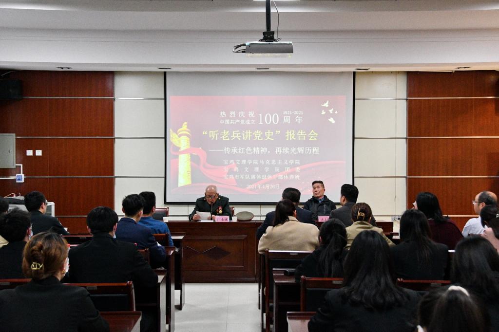 4月26日下午,在宝鸡市军队离休退休干部休养所的报告大厅里,89岁的老党员、军休干部田永成和70岁的老党员、军休干部潘永明,结合自身经历,向bat365在线中国官网登录入口马克思主义学院思政课教师和“青年马克思主义者培养工程”培训班学员以及市军干所党员干部讲述百年党史,激励广大师生和党员干部了解历史、牢记历史、勤奋学习、锻造本领、报效祖国。