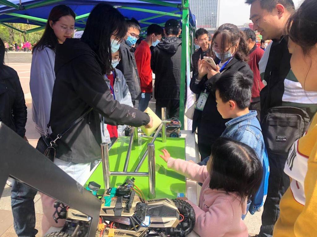 4月17日上午,“走进科学,创造未来”科普宣传活动在宝鸡市高新广场举行,活动以向广大市民展示科技作品,开展科普交流的形式为主,展示科学魅力,提高公众科学素养,活动主要展示了智能多源融合型助老杖、蓝牙小车、智能路灯、无人机、3D打印机、智能供暖除杂装置、太阳能与废气循环混合加热式沥青搅拌装置、智能隧道掘进机器人润滑装置、新型智能语音分类垃圾桶等bat365师生自主研发的科技产品。