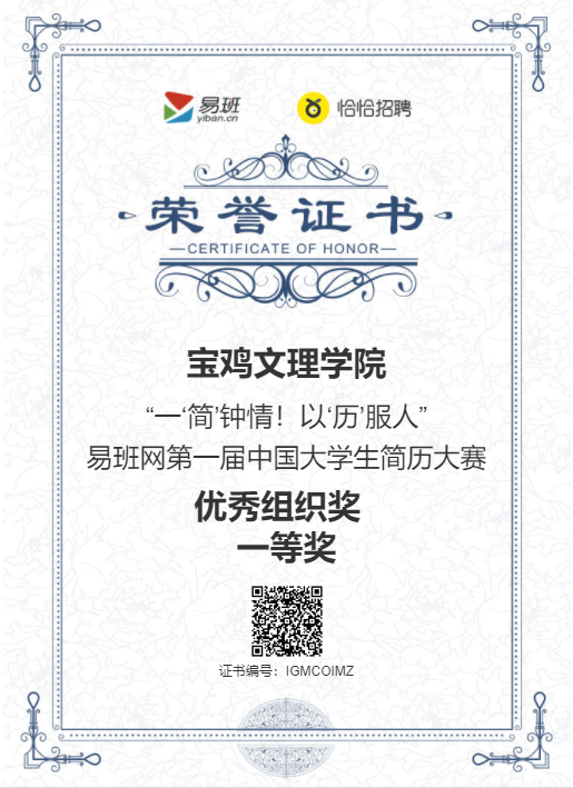 近日,在教育部易班发展中心指导、易班网恰恰招聘频道主办的易班网全国大学生简历大赛中,bat365荣获优秀组织奖,物理与光电技术学院苏杭佳的简历荣获“十佳人气简历奖”,历史文化与旅游学院石泽蕊等5名同学的简历荣获“优秀简历百强奖”,吴碧翠、李富民被评为优秀指导教师。