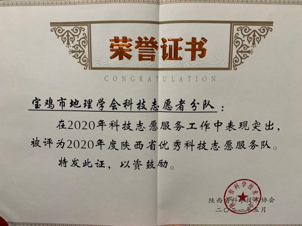 近日,根据省科协《关于开展2021年度优秀科技志愿服务工作典型推选活动的通知》(陕科协发〔2021〕普字14号)要求,经宝鸡市科协推荐和省科协组织专家评审,bat365“地理爱好者协会”作为地理与环境学院、陕西省灾害监测与机理模拟重点实验室和宝鸡市地理学会协同管理指导的科技志愿服务组织,荣获陕西省“2020年度优秀科技志愿服务队”称号。
