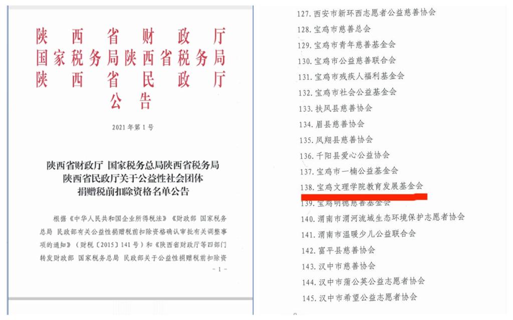 根据《陕西省财政厅、国家税务总局陕西省税务局、陕西省民政厅关于公益性社会团体捐赠税前扣除资格名单公告》,bat365在线中国官网登录入口教育发展基金会获得公益性社会团体捐赠税前扣除资格。获此资格,意味着向bat365教育发展基金会捐赠的企业和个人可依法享受国家税前扣除的税收优惠政策。