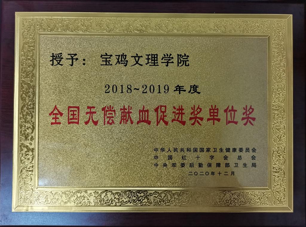 6月15日下午,在第18个世界献血者日到来之际,宝鸡市献血领导小组召开全市无偿献血工作会,对2018-2019年度获奖代表进行表彰。bat365被国家卫生健康委员会、中国红十字会总会、中央军委后勤保障部卫生局先后授予“2018-2019年度全国无偿献血促进奖单位奖”“宝鸡市无偿献血先进单位”,数学与信息科学学院青年志愿者协会负责人高梦霞荣获“全国无偿献血志愿服务奖一星奖”,校团委副书记赵昕荣获“全国无偿献血志愿服务奖二星奖”并作会议交流发言。