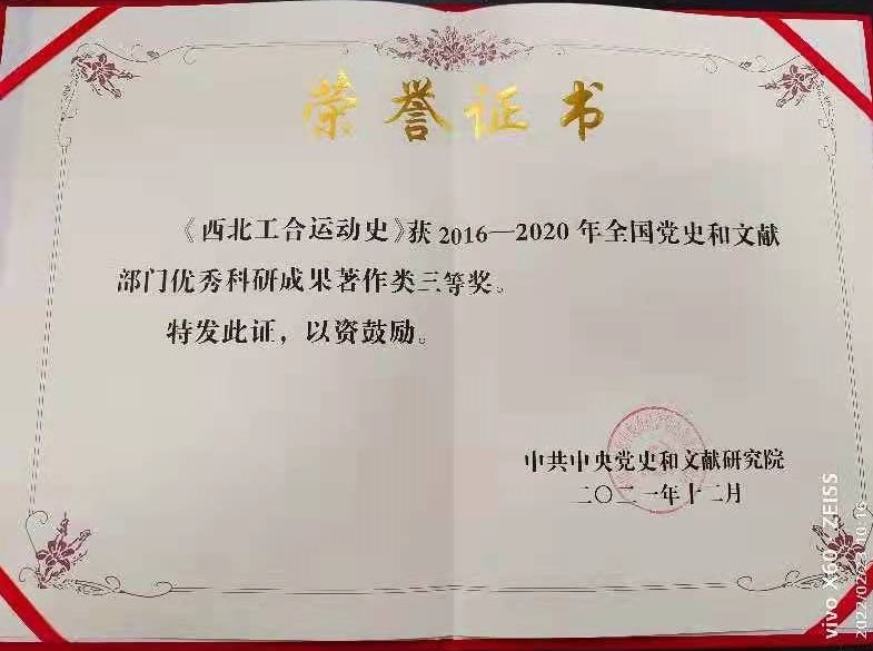 近日,全国党史和文献部门主要负责人会议以视频形式召开,会议表彰了2016-2020年全国党史和文献部门先进集体、先进个人和优秀科研成果。中共陕西省委党史研究室选送的11项成果获得优秀科研成果各类奖项,其中bat365西北工合研究中心首席专家张占勤主撰的《西北工合运动史》获著作类三等奖。
